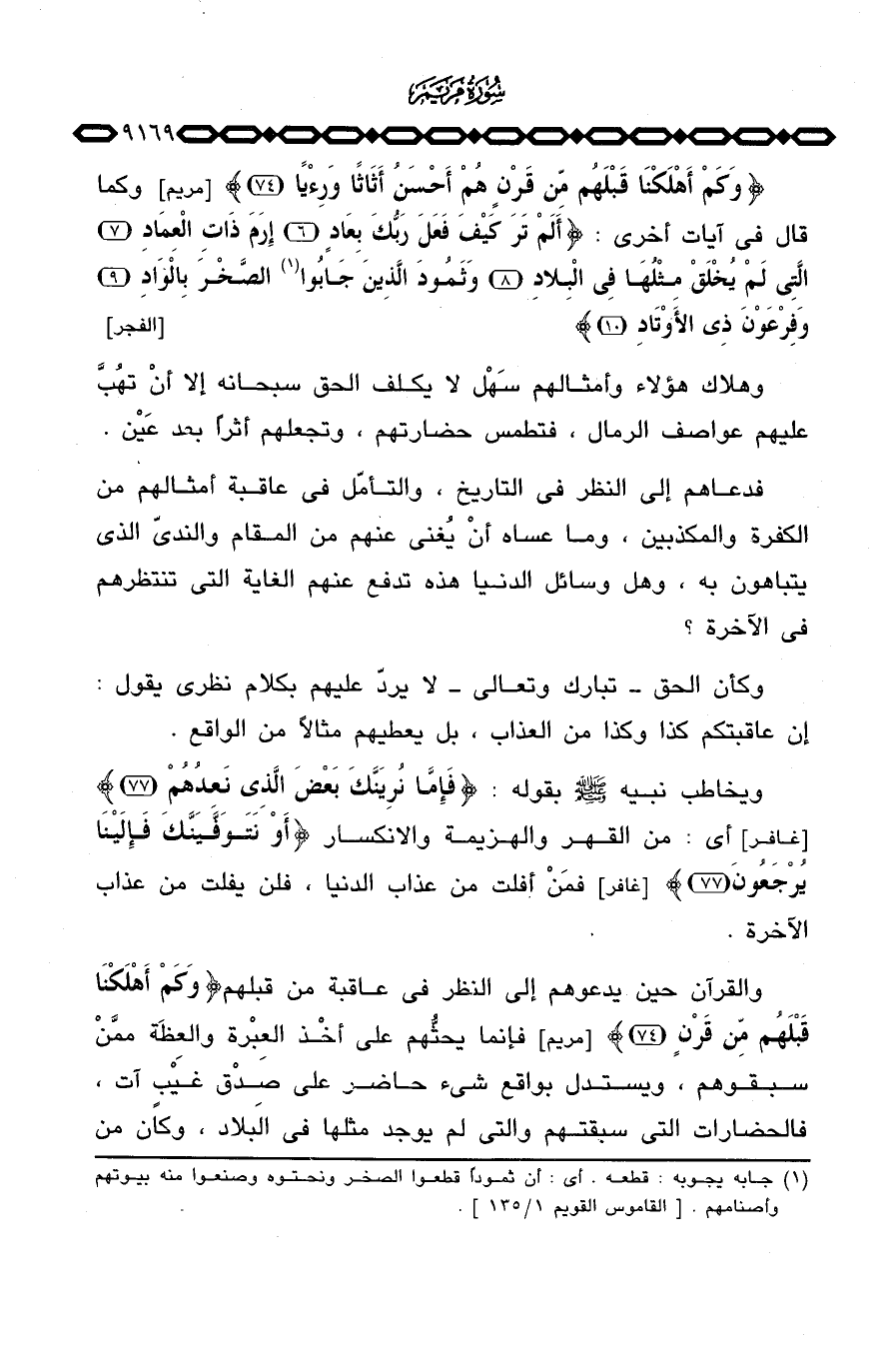 والقرآن حين يدعوهم إلى النظر في عاقبة من قبلهم {وَكَمْ أَهْلَكْنَا قَبْلَهُمْ مِّن قَرْنٍ} [مريم: 74] فإنما يحثُّهم على أخْذ العِبْرة والعِظَة ممَّنْ سبقوهم، ويستدل بواقع شيء حاضر على صِدْق غيْبٍ آتٍ، فالحضارات التي سبقتهم والتي لم يوجد مثلها في البلاد، وكان من