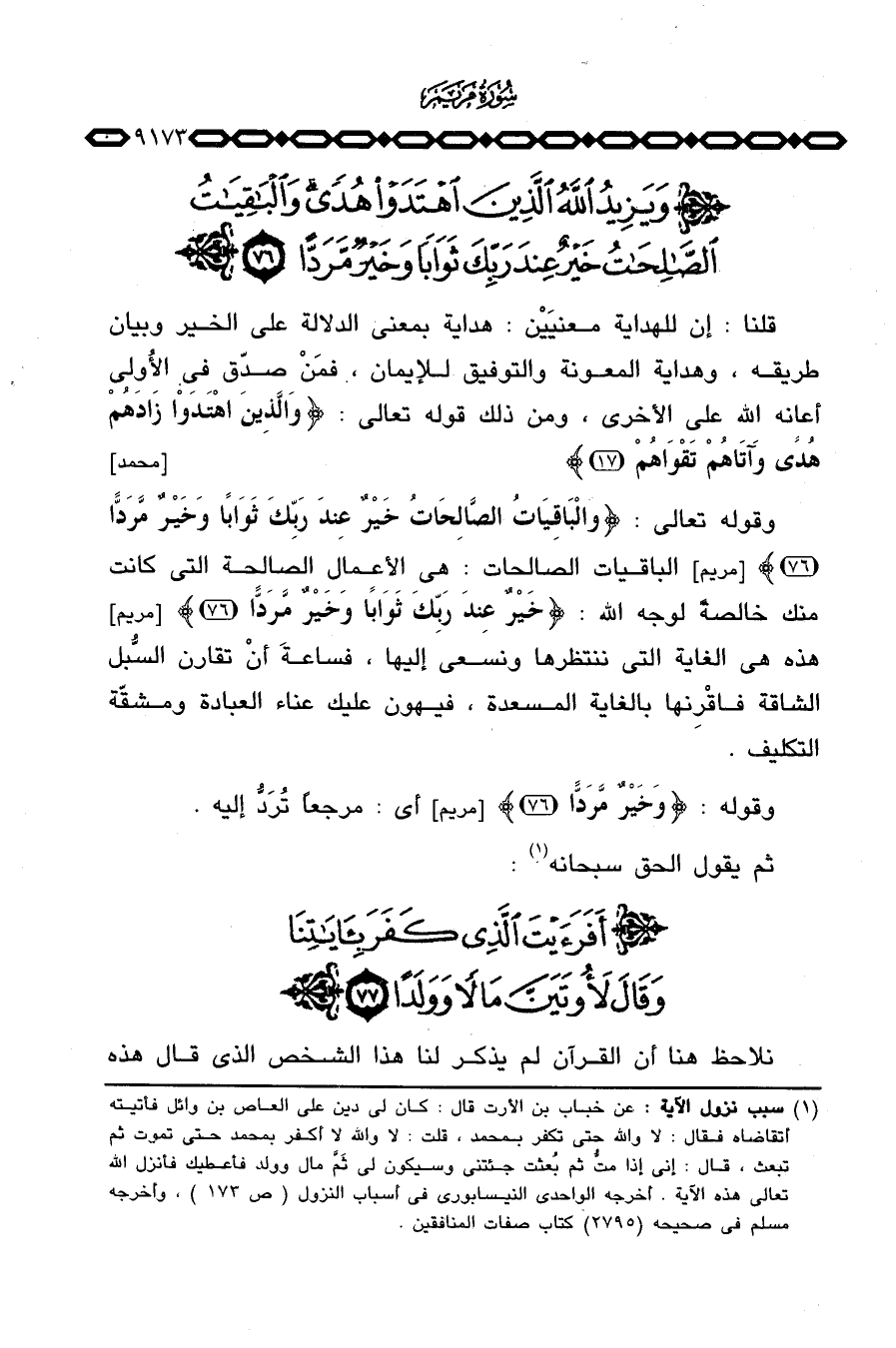 وقوله تعالى: {والباقيات الصالحات خَيْرٌ عِندَ رَبِّكَ ثَوَاباً وَخَيْرٌ مَّرَدّاً} [مريم: 76] الباقيات الصالحات: هي الأعمال الصالحة التي كانت منك خالصةً لوجه الله: {خَيْرٌ عِندَ رَبِّكَ ثَوَاباً وَخَيْرٌ مَّرَدّاً} [مريم: 76] هذه هي الغاية التي ننتظرها ونسعى إليها، فساعةَ أنْ تقارن السُّبل الشاقة فاقْرِنها بالغاية المسعدة، فيهون عليك عناء العبادة ومشقّة التكليف.
