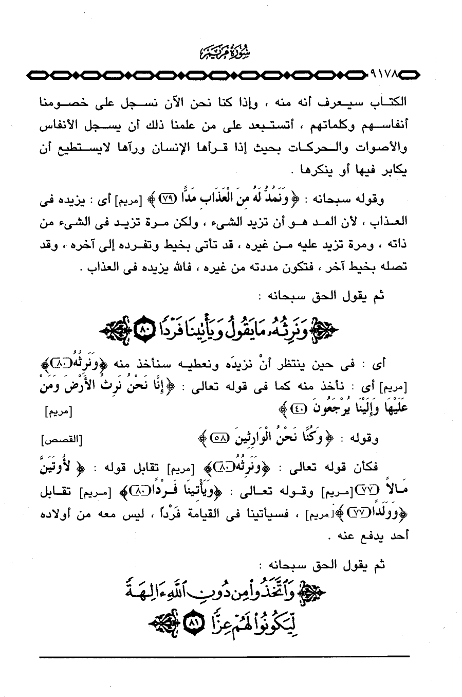 فكأن قوله تعالى: {وَنَرِثُهُ} [مريم: 80] تقابل قوله: {لأُوتَيَنَّ مَالاً} [مريم: 77] وقوله تعالى: {وَيَأْتِينَا فَرْداً} [مريم: 80] تقابل {وَوَلَداً} [مريم: 77] ، فسيأتينا من القيامة فَرْداً، ليس معه من أولاده أحد يدفع عنه.