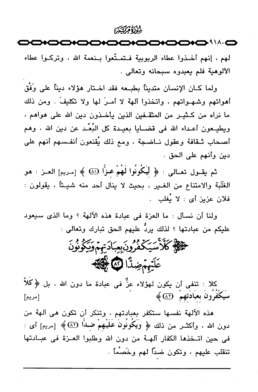هذه الآلهة نفسها ستكفر بعبادتهم، وتنكر أن تكون هي آلهة من دون الله، وأكثر من ذلك {وَيَكُونُونَ عَلَيْهِمْ ضِدّاً} [مريم: 82] أي: في حين اتخاذها الكفار آلهة من دون الله وطلبوا العزة في عبادتها تنقلب عليهم، وتكون ضِدّاً لهم وخَصْماً.