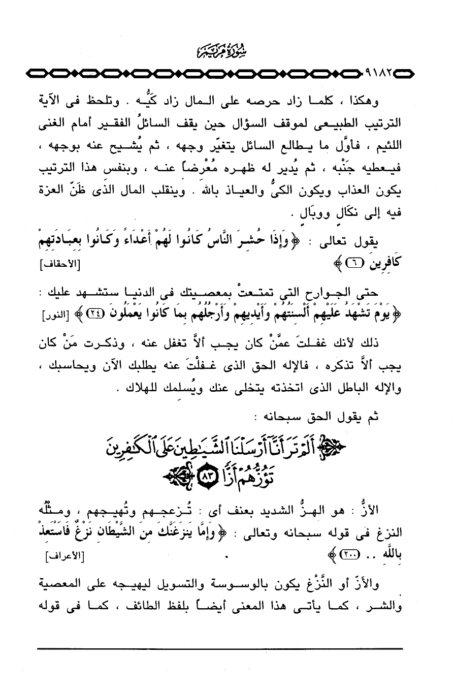 وهكذا، كلما زاد حرصه على المال زاد كَيُّه. وتلحظ في الآية الترتيب الطبيعي لموقف السؤال حين يقف السائلُ الفقير أمام الغني اللئيم، فأوَّل ما يطالع السائل يتغيّر وجهه، ثم يُشيح عنه بوجهه، فيعطيه جَنْبه، ثم يُدير له ظهره مُعْرِضاً عنه، وبنفسِ هذا الترتيب يكون العذاب ويكون الكيُّ والعياذ بالله. وينقلب المال الذي ظَنّ العزة فيه إلى نكَالٍ ووبَالٍ.