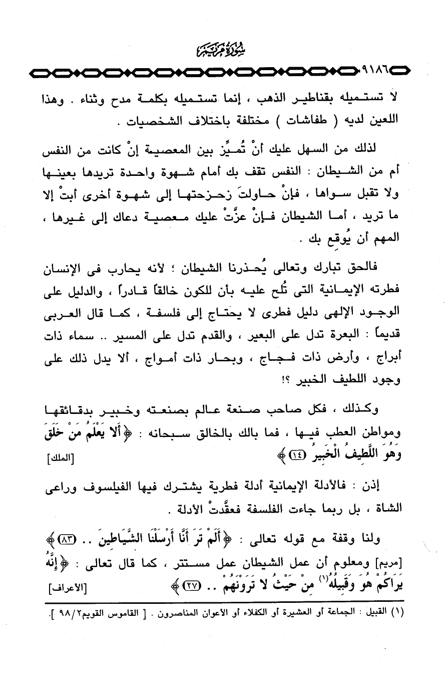 فالحق تبارك وتعالى يُحذرنا الشيطان؛ لأنه يحارب في الإنسان فطرته الإيمانية التي تُلح عليه بأن للكون خالقاً قادراً، والدليل على الوجود الإلهي دليل فطري لا يحتاج إلى فلسفة، كما قال العربي قديماً: البعرة تدل على البعير، والقدم تدل على المسير. . سماء ذات أبراج، وأرض ذات فجاج، وبحار ذات أمواج، ألا يدل ذلك على وجود اللطيف الخبير؟!