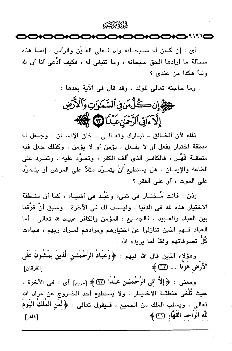 ومعنى: {إِلاَّ آتِي الرحمن عَبْداً} [مريم: 93] أي: في الآخرة، حيث تُلْغَى منطقة الاختيار، ولا يستطيع أحد الخروج عن مراد الله تعالى، ويسلب الملك من الجميع، فيقول تعالى: {لِّمَنِ الملك اليوم لِلَّهِ الواحد القهار} [غافر: 16] .