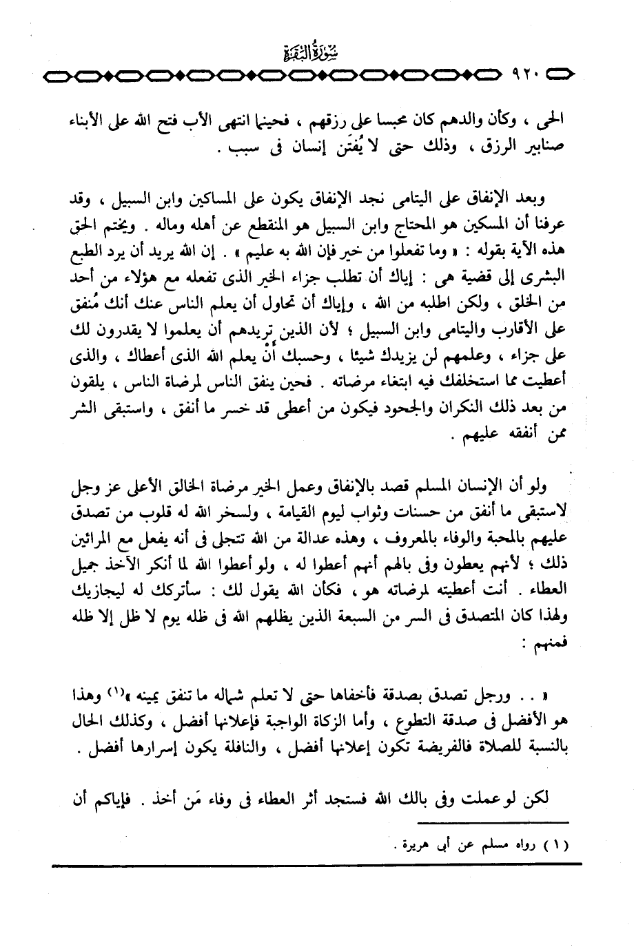 ولو أن الإنسان المسلم قصد بالإنفاق وعمل الخير مرضاة الخالق الأعلى عَزَّ وَجَلَّ لاستبقى ما أنفق من حسنات وثواب ليوم القيامة، ولسخر الله له قلوب من تصدق عليهم بالمحبة والوفاء بالمعروف، وهذه عدالة من الله تتجلى في أنه يفعل مع المرائين ذلك؛ لأنهم يعطون وفي بالهم أنهم أعطوا له، ولو أعطوا الله لما أنكر الآخذ جميل العطاء. أنت أعطيته لمرضاته هو، فكأن الله يقول لك: سأتركك له ليجازيك ولهذا كان المتصدق في السر من السبعة الذين يظلهم الله في ظله يوم لا ظل إلا ظله فمنهم: «. . ورجل تصدق بصدقة فأخفاها حتى لا تعلم شماله ما تنفق يمينه» وهذا هو الأفضل في صدقة التطوع، وأما الزكاة الواجبة فإعلانها أفضل، وكذلك الحال بالنسبة للصلاة فالفريضة تكون إعلانها أفضل، والنافلة يكون إسرارها أفضل. لكن لو عملت وفي بالك الله فستجد أثر العطاء وفي وفاء من أخذ. فإياك أن