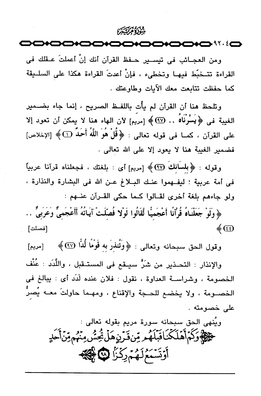 وتلحظ هنا أن القرآن لم يأْتِ باللفظ الصريح، إنما جاء بضمير الغيبة في {يَسَّرْنَاهُ} [مريم: 97] لأن الهاء هنا لا يمكن أن تعود إلا على القرآن، كما في قوله تعالى: {قُلْ هُوَ الله أَحَدٌ} [الإخلاص: 1] فضمير الغيبة هنا لا يعود إلا على الله تعالى.