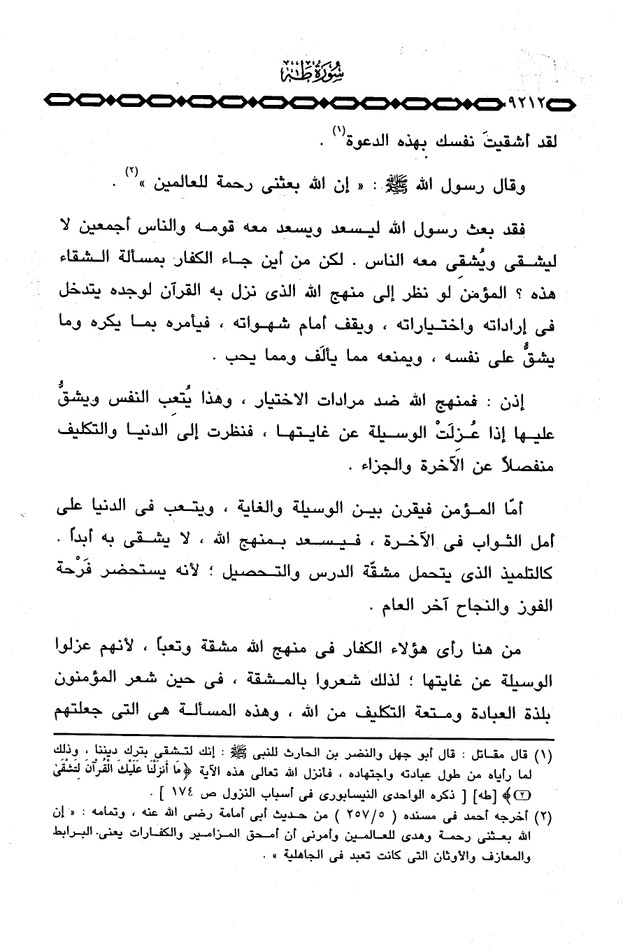 فقد بعث رسول الله ليسعد ويسعد معه قومه والناس أجمعين لا ليشقى ويُشقِي معه الناس. لكن من أين جاء الكفار بمسألة الشقاء هذه؟ المؤمن لو نظر إلى منهج الله الذي نزل به القرآن لوجده يتدخل في إراداته واختياراته، ويقف أمام شهواته، فيأمره بما يكره وما يشقُّ على نفسه، ويمنعه مما يألَف ومما يحب.