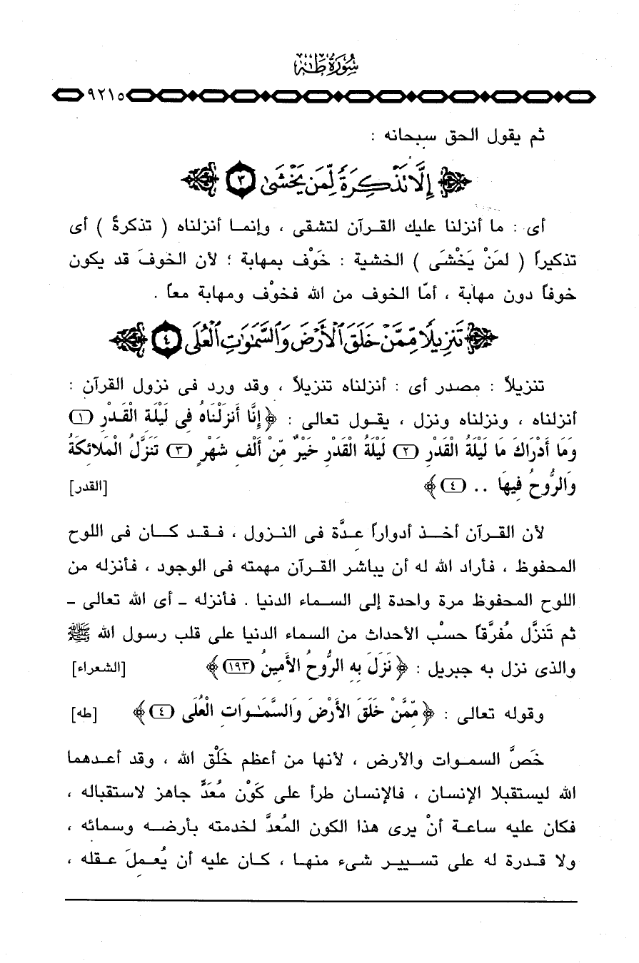 أي: ما أنزلنا عليك القرآن لتشقى، وإنما أنزلناه (تذكرةً) أي تذكيراً (لمَنْ يَخْشَى) الخشية: خَوْف بمهابة؛ لأن الخوفَ قد يكون خوفاً دون مهابة، أمّا الخوف من الله فخوْف ومهابة معاً.