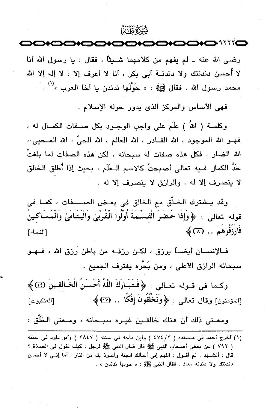 لم يفهم من كلامهما شيئاً، فقال: يا رسول الله أنا لا أُحسن دندنتك ولا دندنة أبي بكر، أنا لا أعرف إلا: لا إله إلا الله محمد رسول الله. فقال صَلَّى اللَّهُ عَلَيْهِ وَسَلَّم َ:» حَوْلَها ندندن يا أخا العرب «.