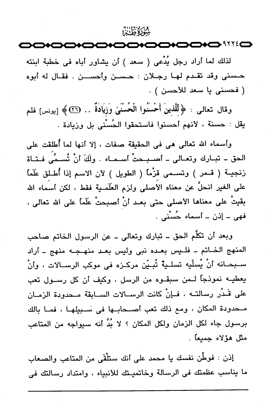 لذلك لما أراد رجل يُدْعى (سعد) أن يشاور أباه في خطبة ابنته حسنى وقد تقدم لها رجلان: حسن وأحسن. فقال له أبوه (فحسنى يا سعد للأحسن) .