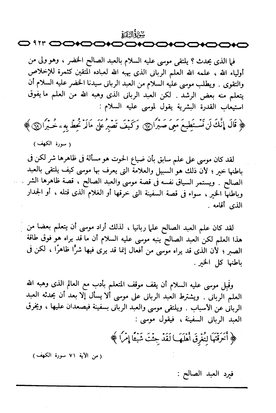 وقَبِل موسى عليه السلام أن يقف موقف المتعلم بأدب مع العالم الذي وهبه الله العلم الرباني. ويشترط العبد الرباني على موسى ألا يسأل إلا بعد أن يحدثه العبد الرباني عن الأسباب. ويلتقي موسى والعبد الرباني بسفينة فيصعدان عليها، ويخرق العبد الرباني السفينة، فيقول موسى: {أَخَرَقْتَهَا لِتُغْرِقَ أَهْلَهَا لَقَدْ جِئْتَ شَيْئاً إِمْراً} [الكهف: 71]