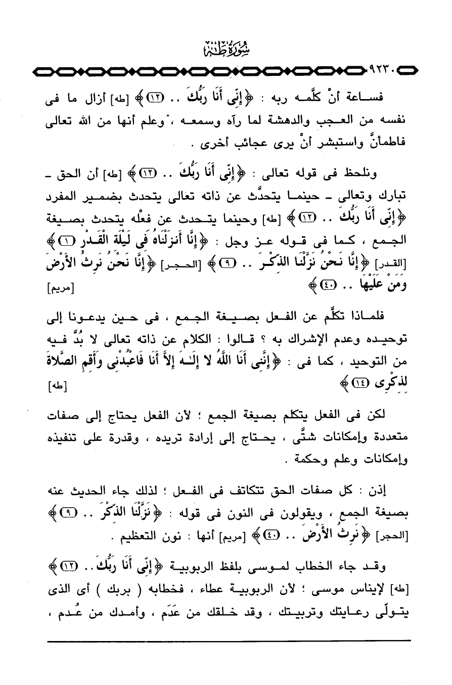 ونلحظ في قوله تعالى: {إني أَنَاْ رَبُّكَ} [طه: 12] أن الحق تبارك وتعالى حينما يتحدَّث عن ذاته تعالى يتحدث بضمير المفرد {إني أَنَاْ رَبُّكَ} [طه: 12] وحينما يتحدث عن فِعْله يتحدث بصيغة الجمع، كما في قوله عَزَّ وَجَلَّ: {إِنَّا أَنزَلْنَاهُ فِي لَيْلَةِ القدر} [القدر: 1] {إِنَّا نَحْنُ نَزَّلْنَا الذكر} [الحجر: 9] {إِنَّا نَحْنُ نَرِثُ الأرض وَمَنْ عَلَيْهَا} [مريم: 40] .