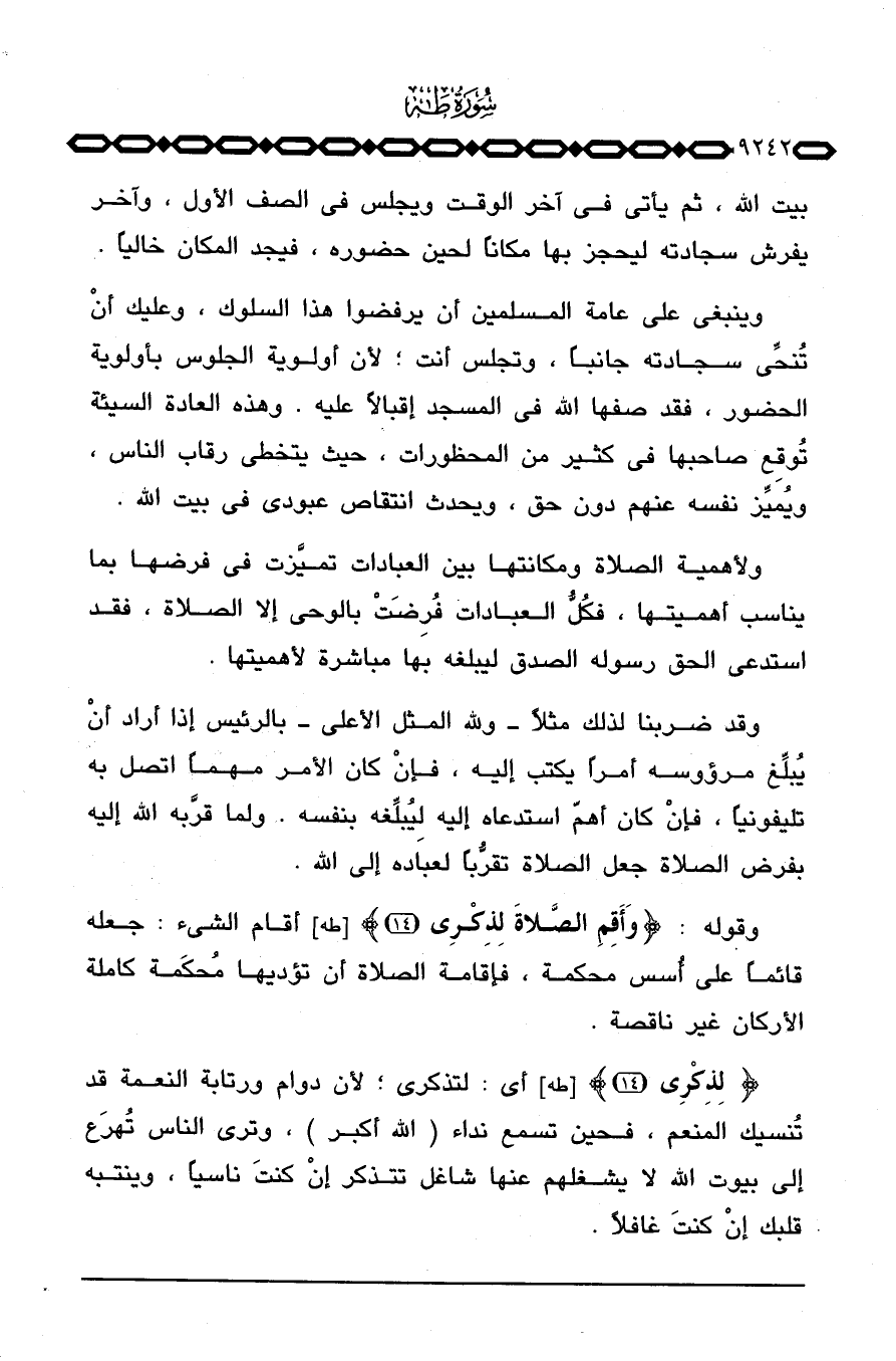 {لذكري} [طه: 14] أي: لتذكري؛ لأن دوام ورتابة النعمة قد تُنسيك المنعم، فحين تسمع نداء (الله أكبر) ، وترى الناس تُهرَع إلى بيوت الله لا يشغلهم عنها شاغل تتذكر إنْ كنتَ ناسياً، وينتبه قلبك إنْ كنتَ غافلاً.