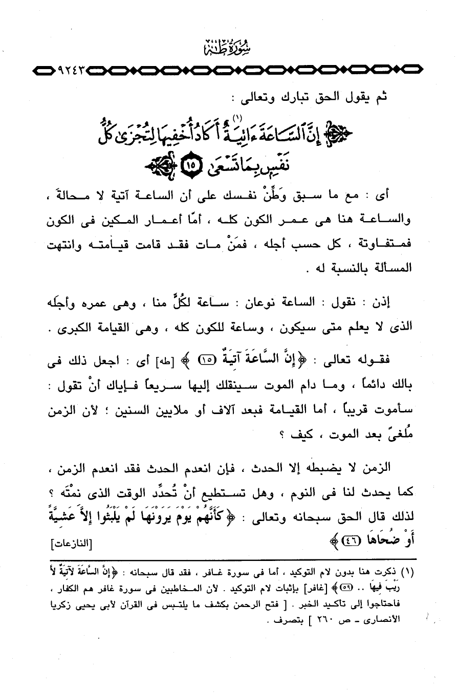 فقوله تعالى: {إِنَّ الساعة آتِيَة} [طه: 15] أي: اجعل ذلك في بالك دائماً، ومادام الموت سينقلك إليها سريعاً فإياك أنْ تقول: سأموت قريباً، أما القيامة فبعد آلاف أو ملايين السنين؛ لأن الزمن مُلغىً بعد الموت، كيف؟
