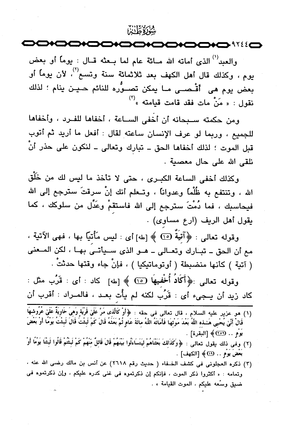 والعبد الذي أماته الله مائة عام لما بعثه قال: يوماً أو بعض يوم، وكذلك قال أهل الكهف بعد ثلاثمائة سنة وتسع، لأن يوماً أو بعض يوم هي أقْصى ما يمكن تصوُّره للنائم حين ينام؛ لذلك نقول: «مَنْ مات فقد قامت قيامته» .