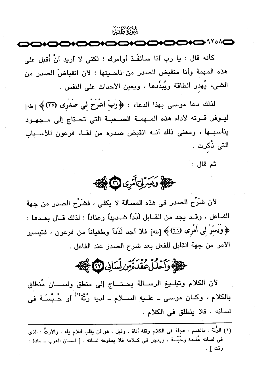 لذلك دعا موسى بهذا الدعاء: {رَبِّ اشرح لِي صَدْرِي} [طه: 25] ليوفر قوته لأداء هذه المهمة الصعبة التي تحتاج إلى مجهود يناسبها، ومعنى ذلك أنه انقبض صدره من لقاء فرعون للأسباب الذي ذُكِرت.