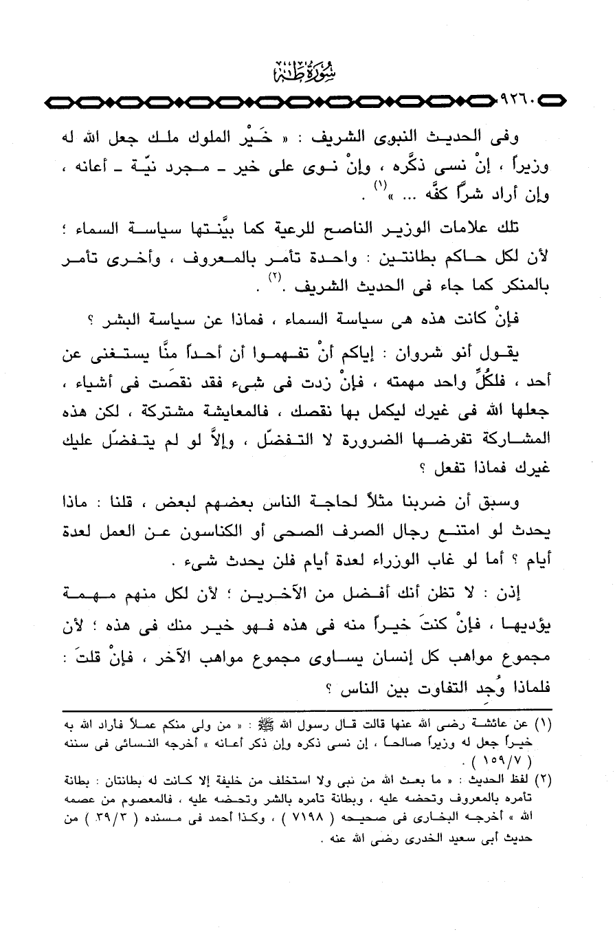 تلك علامات الوزير الناصح للرعية كما بيَّنتها سياسة السماء؛ لأن لكل حاكم بطانتين: واحدة تأمر بالمعروف، وأخرى تأمر بالمنكر كما جاء في الحديث الشريف.