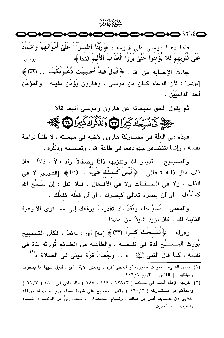 وقوله: {نُسَبِّحَكَ كَثِيراً} [طه: 33] أي: دائماً، فكأن التسبيح يُورِث المسبِّح لذة في نفسه، والطاعة من الطائع تُورثه لذة في نفسه، كما قال النبي صَلَّى اللَّهُ عَلَيْهِ وَسَلَّم َ: « ... وجُعِلتْ قرّة عيني في الصلاة» .