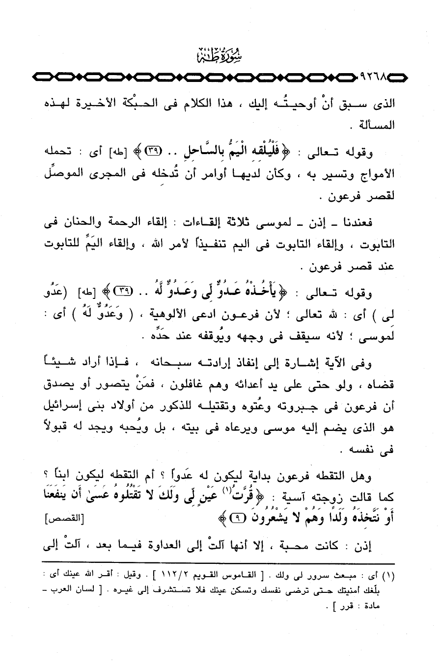 وقوله تعالى: {يَأْخُذْهُ عَدُوٌّ لِّي وَعَدُوٌّ لَّهُ} [طه: 39] (عَدُو لِي) أي: لله تعالى؛ لأن فرعون ادعى الألوهية، (وَعَدُوٌّ لَهُ) أي: لموسى؛ لأنه سيقف في وجهه ويُوقفه عند حَدِّه.