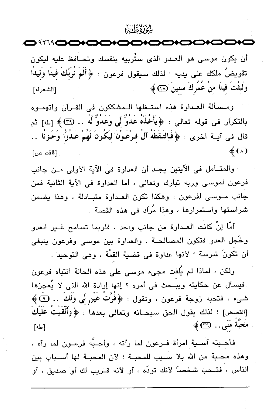 أمّا إنْ كانت العداوة من جانب واحد، فلربما تسامح غير العدو وخَجِل العدو فتكون المصالحة. والعداوة بين موسى وفرعون ينبغي أن تكونَ شرسة؛ لأنها عداوة في قضية القِمَّة، وهي التوحيد.