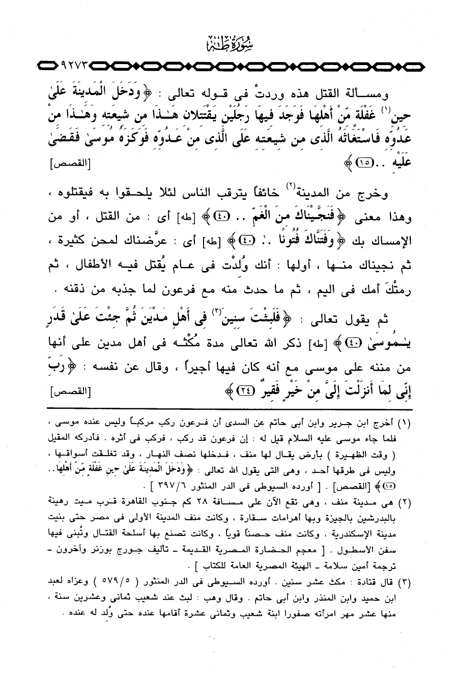 ومسألة القتل هذه وردتْ في قوله تعالى: {وَدَخَلَ المدينة على حِينِ غَفْلَةٍ مِّنْ أَهْلِهَا فَوَجَدَ فِيهَا رَجُلَيْنِ يَقْتَتِلاَنِ هذا مِن شِيعَتِهِ وهذا مِنْ عَدُوِّهِ فاستغاثه الذي مِن شِيعَتِهِ عَلَى الذي مِنْ عَدُوِّهِ فَوَكَزَهُ موسى فقضى عَلَيْهِ} [القصص: 15] .