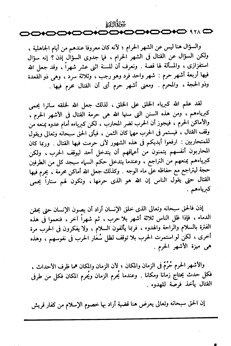 لقد علم الله كبرياء الخلق على الخلق، لذلك جعل الله لخلقه ساترا يحمي كبرياءهم، ومن هذه السنن التي سنها الله هي حرمة القتال في الأشهر الحرم، والأماكن الحرم، فيجوز أن الحرب تضر المحارب، لكن كبرياءه أمام عدوه يمنعه من وقف القتال، فيستمر في الحرب مهما كان الثمن، فيأتي الحق سبحانه وتعالى ويقول للمتحاربين: ارفعوا أيديكم في هذه الشهور لأني حرمت فيها القتال. وربما كان المحاربون أنفسهم يتمنون من أعماقهم أن يتدخل أحد ليوقف الحرب، ولكن كبرياءهم يمنعهم من التراجع، وعندما يتدخل حكم السماء سيجد كل من الطرفين حجة ليتراجع مع حفاظه على ماء الوجه. وكذلك جعل الله أماكن محرمة، يحرم فيها القتال حتى يقول الناس إن الله هو الذي حرمها، وتكون لهم ستاراً يحمي كبرياءهم.