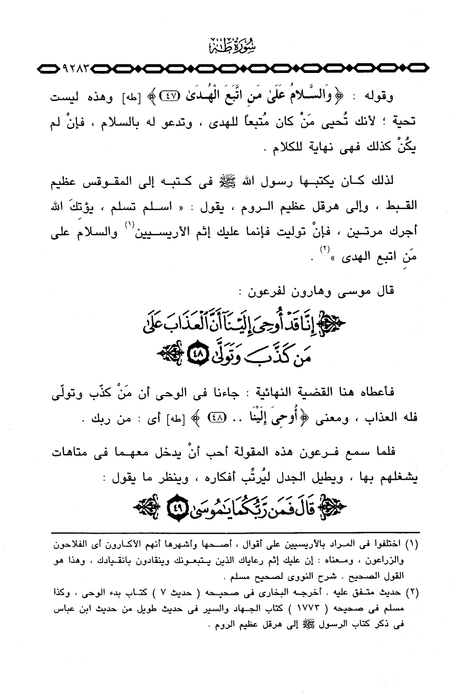 لذلك كان يكتبها رسول الله صَلَّى اللَّهُ عَلَيْهِ وَسَلَّم َ في كتبه إلى المقوقس عظيم القبط، وإلى هرقل عظيم الروم، يقول: «اسلم تسلم، يؤتِكَ الله أجرك مرتين، فإنْ توليت فإنما عليك إثم الأريسيين والسلام على مَنِ اتبع الهدى» .