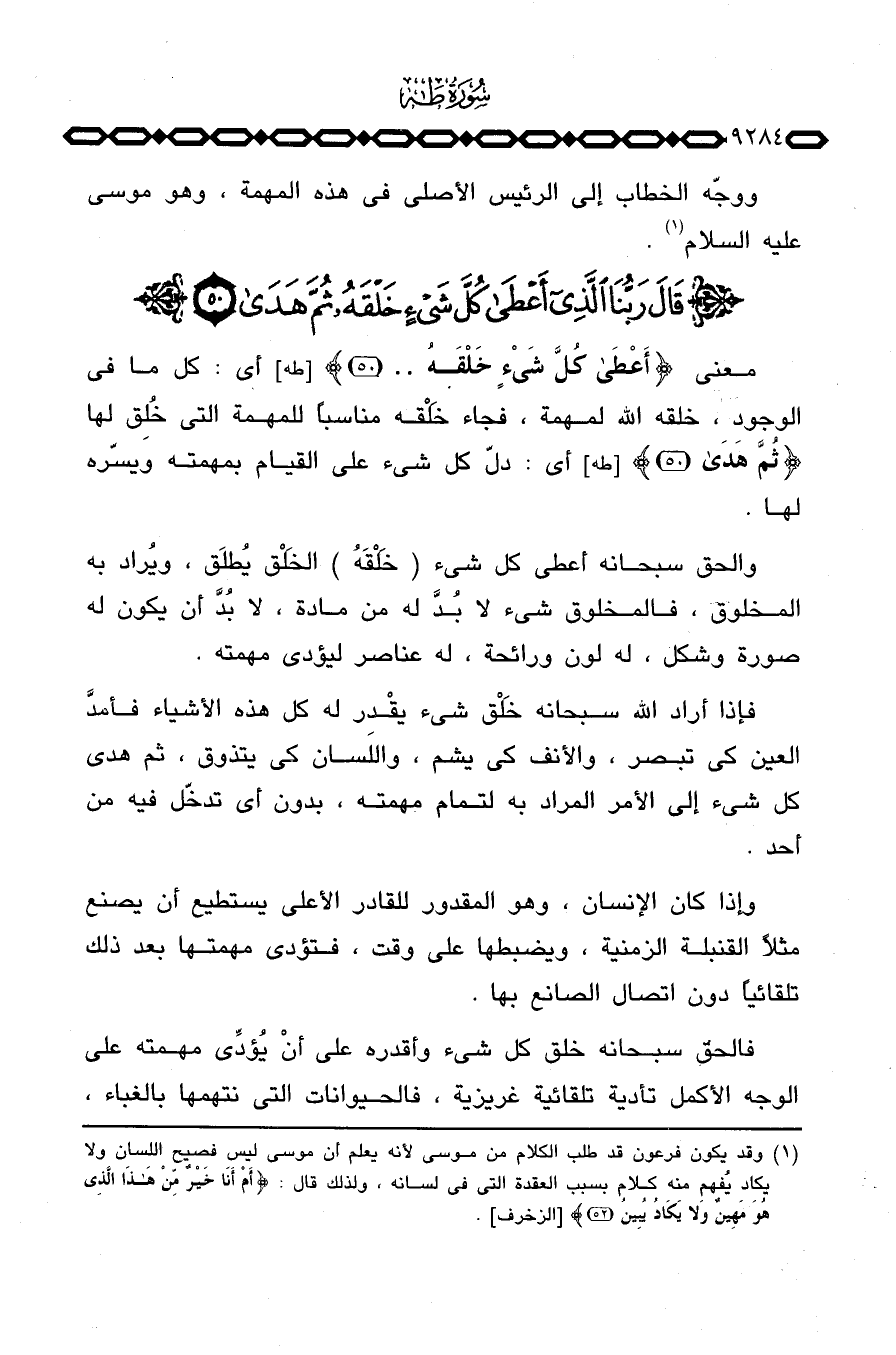 معنى {اأعطى كُلَّ شَيءٍ خَلْقَهُ} [طه: 50] أي: كل ما في الوجود، خلقه الله لمهمة، فجاء خَلْقه مناسباً للمهمة التي خُلِق لها {ثُمَّ هدى} [طه: 50] أي: دلّ كل شيء على القيام بمهمته ويسّره لها.