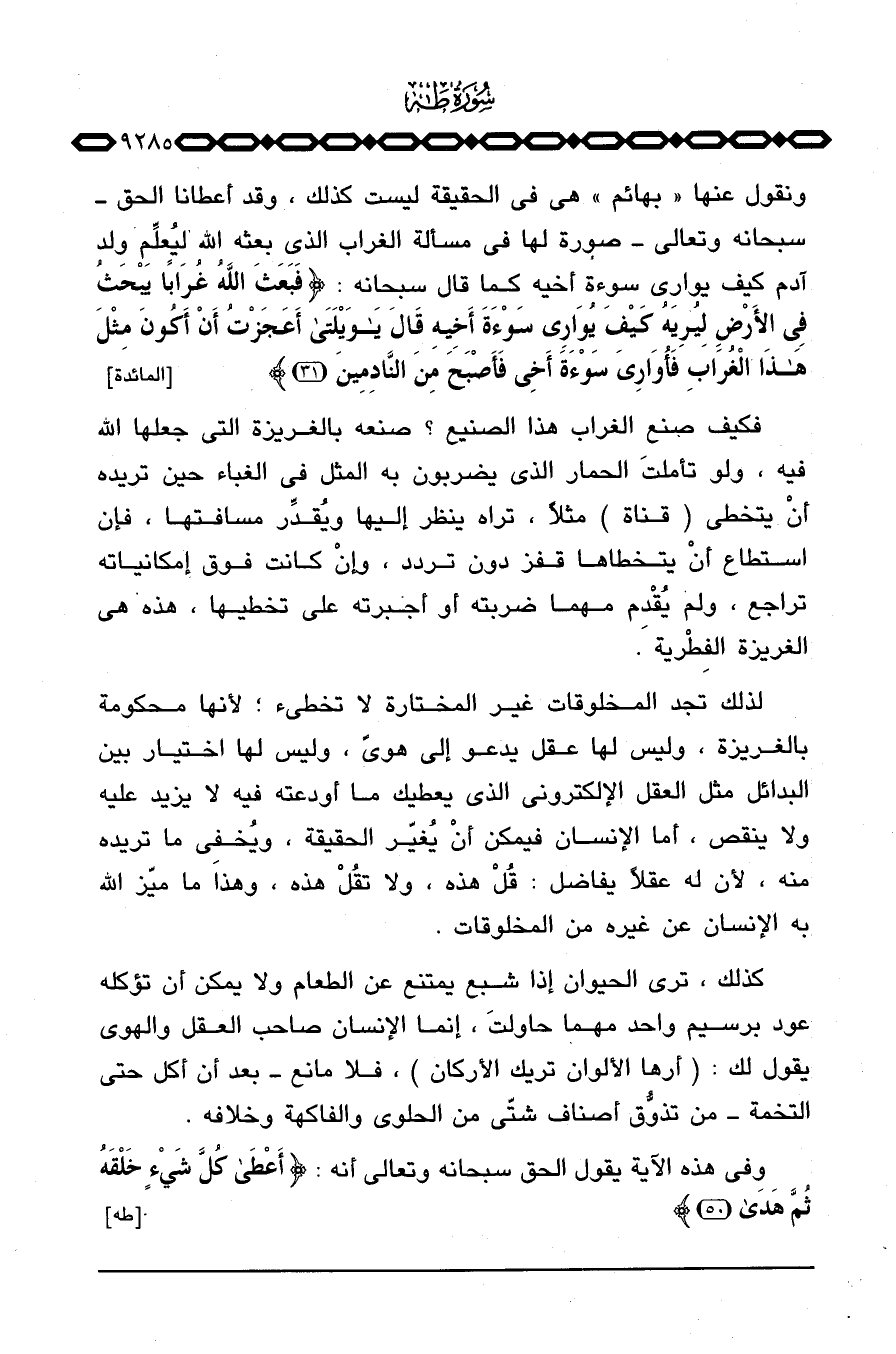 ونقول عنها: «بهائم» هي في الحقيقة ليست كذلك، وقد أعطانا الحق سبحانه وتعالى صورة لها في مسألة الغراب الذي بعثه الله ليُعلِّم ولد آدم كيف يواري سوءة أخيه كما قال سبحانه: {فَبَعَثَ الله غُرَاباً يَبْحَثُ فِي الأرض لِيُرِيَهُ كَيْفَ يُوَارِي سَوْءَةَ أَخِيهِ قَالَ يَاوَيْلَتَا أَعَجَزْتُ أَنْ أَكُونَ مِثْلَ هذا الغراب فَأُوَارِيَ سَوْءَةَ أَخِي فَأَصْبَحَ مِنَ النادمين} [المائدة: 31] .