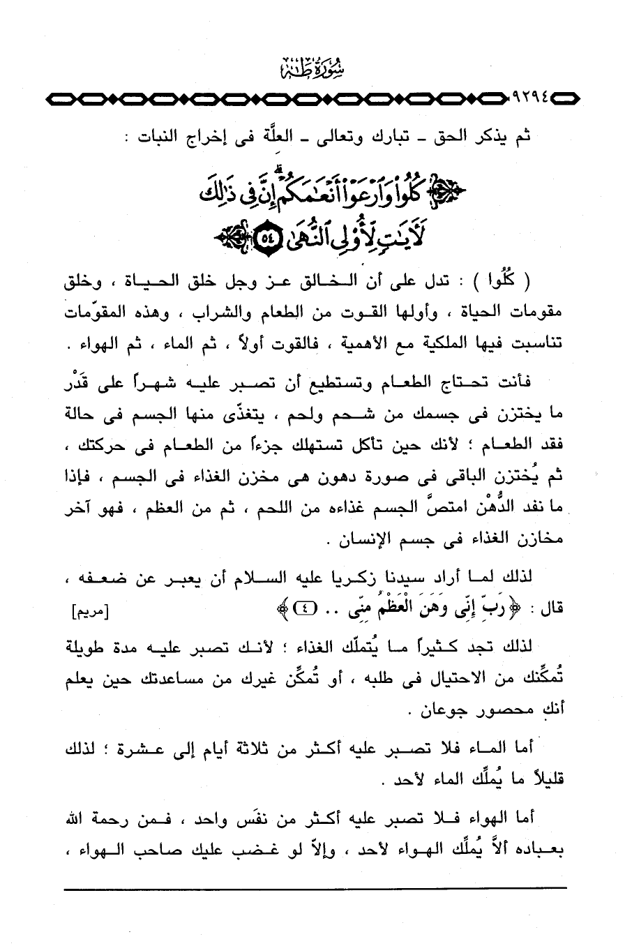 فأنت تحتاج الطعام وتستطيع أن تصبر عليه شهراً على قَدْر ما يختزن في جسمك من شحم ولحم، يتغذّى منها الجسم في حالة فقد الطعام؛ لأنك حين تأكل تستهلك جزءاً من الطعام في حركتك، ثم يُختزن الباقي في صورة دهون هي مخزن الغذاء في الجسم، فإذا ما نفد الدُّهْن امتصَّ الجسم غذاءه من اللحم، ثم من العظم، فهو آخر مخازن الغذاء في جسم الإنسان.