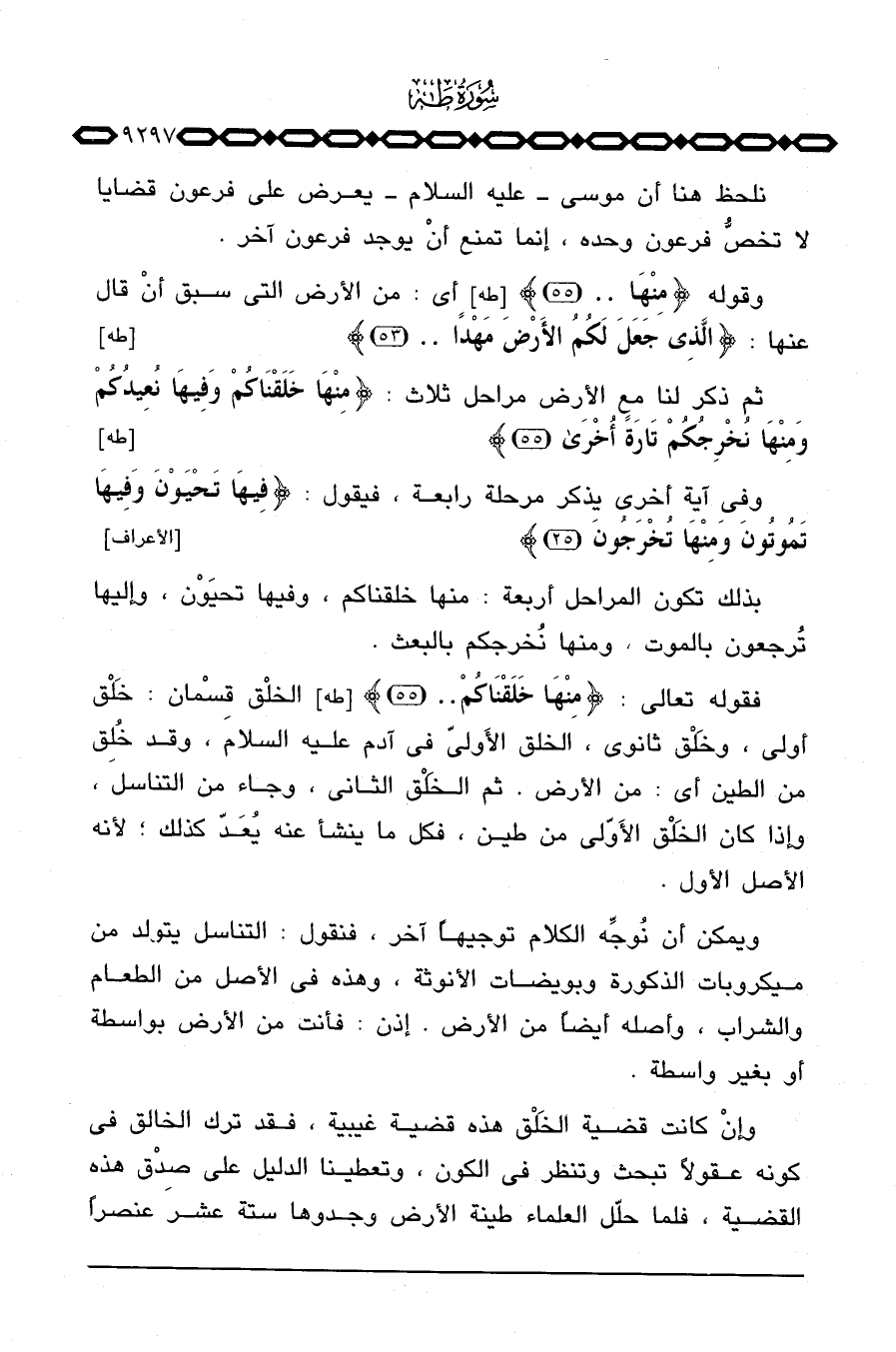 فقوله تعالى: {مِنْهَا خَلَقْنَاكُمْ} [طه: 55] الخلْق قِسْمان: خَلْق أولي، وخَلْق ثانوي، الخلق الأَوليّ في أدم عليه السلام، وقد خُلِق من الطين أي: من الأرض. ثم الخَلْق الثاني، وجاء من التناسل، وإذا كان الخَلْق الأَوْلي من طين، فكل ما ينشأ عنه يُعَدّ كذلك؛ لأنه الأصل الأول.