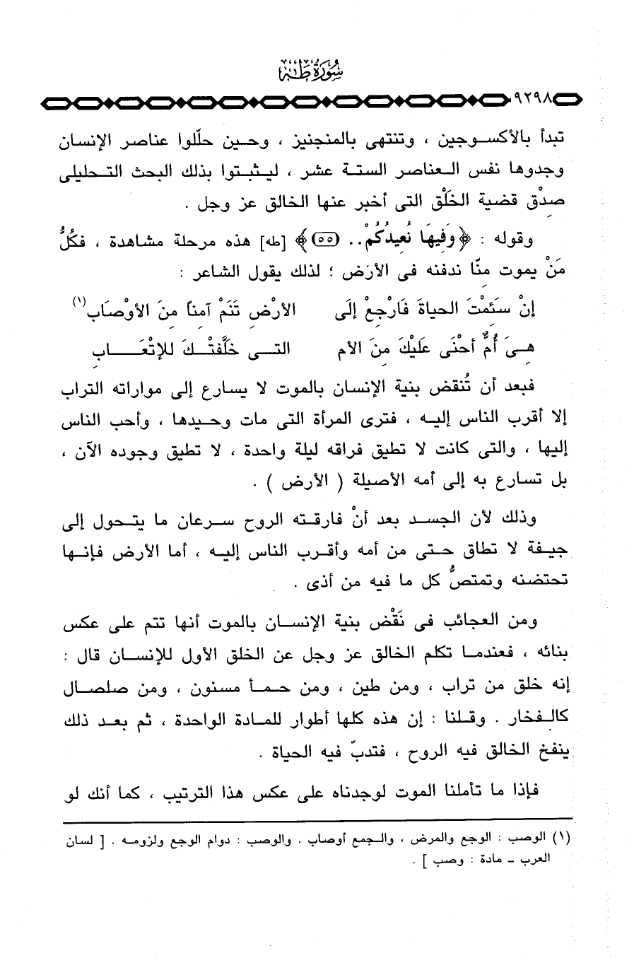 ومن العجائب في نَقْض بنية الإنسان بالموت أنها تتم على عكس بنائه، فعندما تكلم الخالق عَزَّ وَجَلَّ عن الخلق الأول للإنسان قال: إنه خلق من تراب، ومن طين، ومن حمأ مسنون، ومن صلصال كالفخار. وقلنا: إن هذه كلها أطوار للمادة الواحدة، ثم بعد ذلك ينفخ الخالق فيه الروح، فتدبّ فيه الحياة.