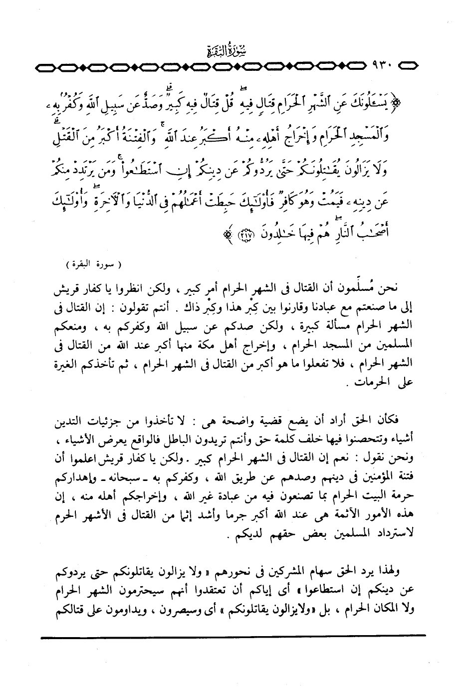 {يَسْأَلُونَكَ عَنِ الشهر الحرام قِتَالٍ فِيهِ قُلْ قِتَالٌ فِيهِ كَبِيرٌ وَصَدٌّ عَن سَبِيلِ الله وَكُفْرٌ بِهِ والمسجد الحرام وَإِخْرَاجُ أَهْلِهِ مِنْهُ أَكْبَرُ عِندَ الله والفتنة أَكْبَرُ مِنَ القتل وَلاَ يَزَالُونَ يُقَاتِلُونَكُمْ حتى يَرُدُّوكُمْ عَن دِينِكُمْ إِن اسْتَطَاعُواْ وَمَن يَرْتَدِدْ مِنْكُمْ عَن دِينِهِ فَيَمُتْ وَهُوَ كَافِرٌ فأولائك حَبِطَتْ أَعْمَالُهُمْ فِي الدنيا والآخرة وأولائك أَصْحَابُ النار هُمْ فِيهَا خَالِدُونَ} [البقرة: 217]