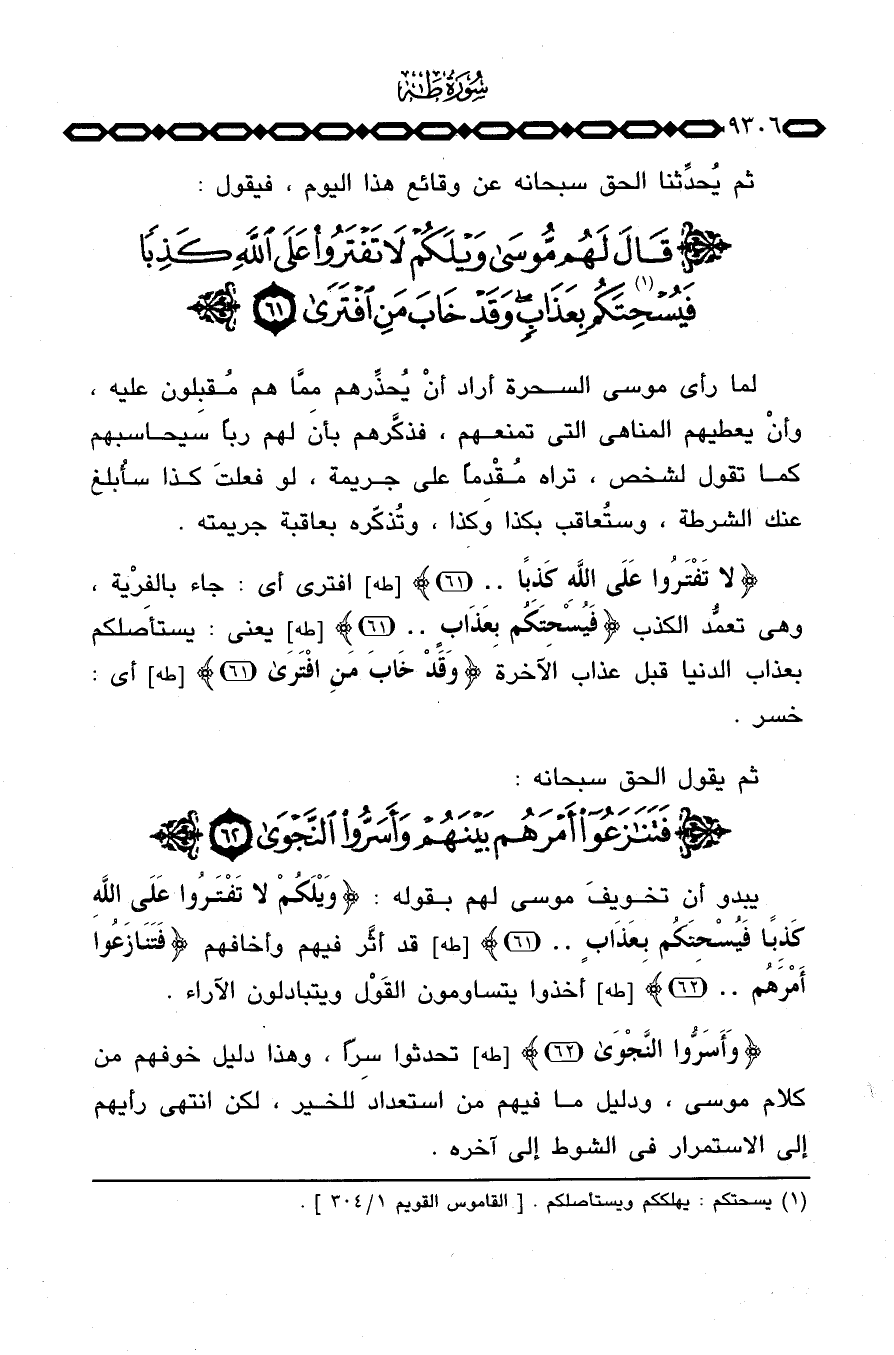 {لاَ تَفْتَرُواْ عَلَى الله كَذِباً} [طه: 61] افترى أي: جاء بالفِرْية، وهي تعمُّد الكذب {فَيُسْحِتَكُم بِعَذَابٍ} [طه: 61] يعني: يستأصلكم بعذاب الدنيا قبل عذاب الآخرة {وَقَدْ خَابَ مَنِ افترى} [طه: 61] أي: خسر.