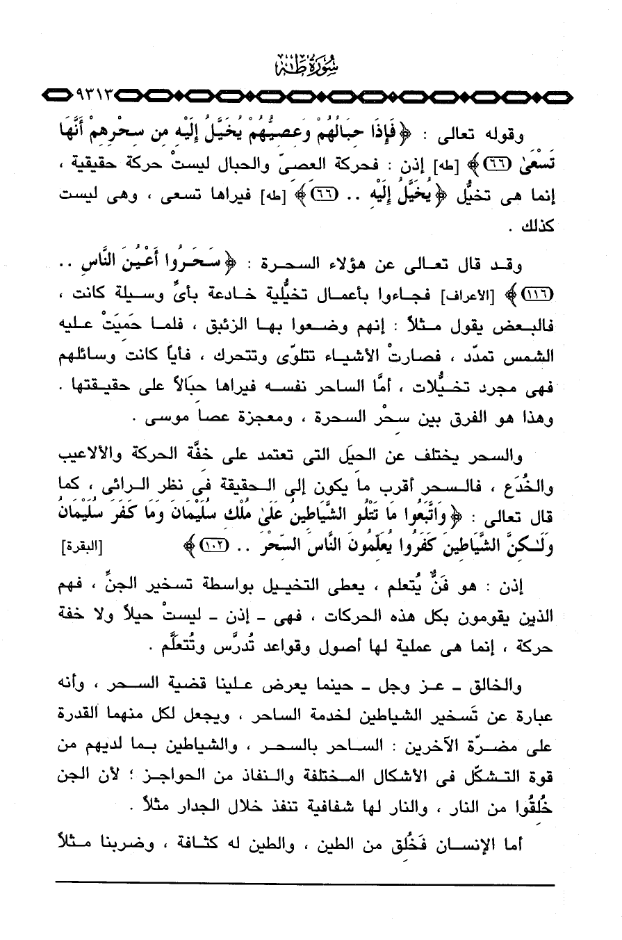 إذن: هو فَنُّ يُتعلم، يعطي التخييل بواسطة تسخير الجنِّ، فهم الذين يقومون بكل هذه الحركات، فهي إذن ليستْ حيلاً ولا خفة حركة، إنما هي عملية لها أصول وقواعد تُدرَّس وتُتعَلَّم.