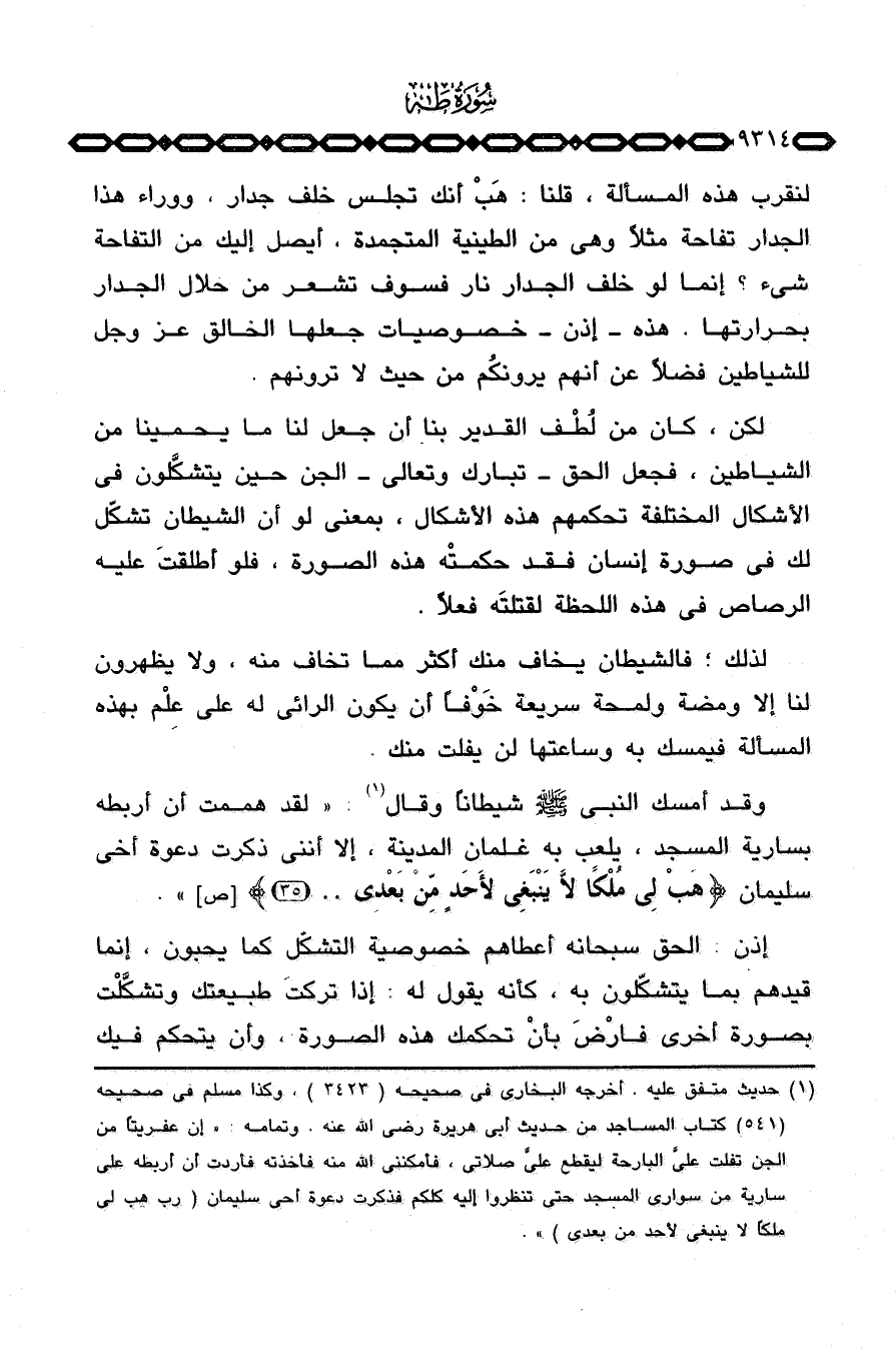 وقد أمسك النبي صَلَّى اللَّهُ عَلَيْهِ وَسَلَّم َ شيطاناً وقال: «لقد هممت أن أربطه بسارية المسجد، يلعب به غلمان المدينة، إلا أنني ذكرت دعوة أخي سليمان {وَهَبْ لِي مُلْكاً لاَّ يَنبَغِي لأَحَدٍ مِّن بعدي} [ص: 35] » .