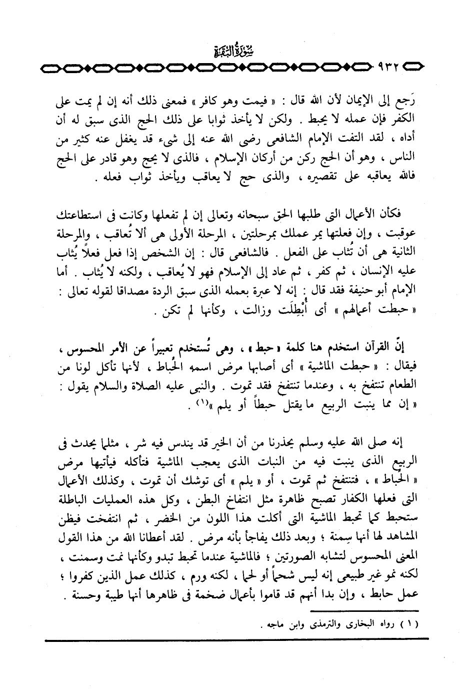 فكأن الأعمال التي طلبها الحق سبحانه وتعالى إن لم تفعلها وكانت في استطاعتك عوقبت، وإن فعلتها يمر عملك بمرحلتين، المرحلة الأولى هي ألا تُعاقب، والمرحلة الثانية هي أن تُثاب على الفعل. فالشافعي قال: إن الشخص إذا فعل فعلاً يُثاب عليه الإنسان، ثم كفر، ثم عاد إلى الإسلام فهو لا يُعاقب، ولكنه يُثاب. أما الإمام أبو حنيفة فقد قال: إنه لا عبرة بعمله الذي سبق الردة مصداقا لقوله تعالى: {حَبِطَتْ أَعْمَالُهُمْ} أي أبطلت وزالت، وكأنها لم تكن. إن القرآن استخدم هنا كلمة «حبط» ، وهي تستخدم تعبيرا عن الأمر المحسوس فيقال: «حبطت الماشية» أي أصابها مرض اسمه الحباط، لأنها تأكل لونا من الطعام تنتفخ به، وعندما تنتفخ فقد تموت. والنبي عَلَيْهِ الصَّلَاة وَالسَّلَام ُ يقول: «إن مما ينبت الربيع ما يقتل حبطاً أو يلم» .