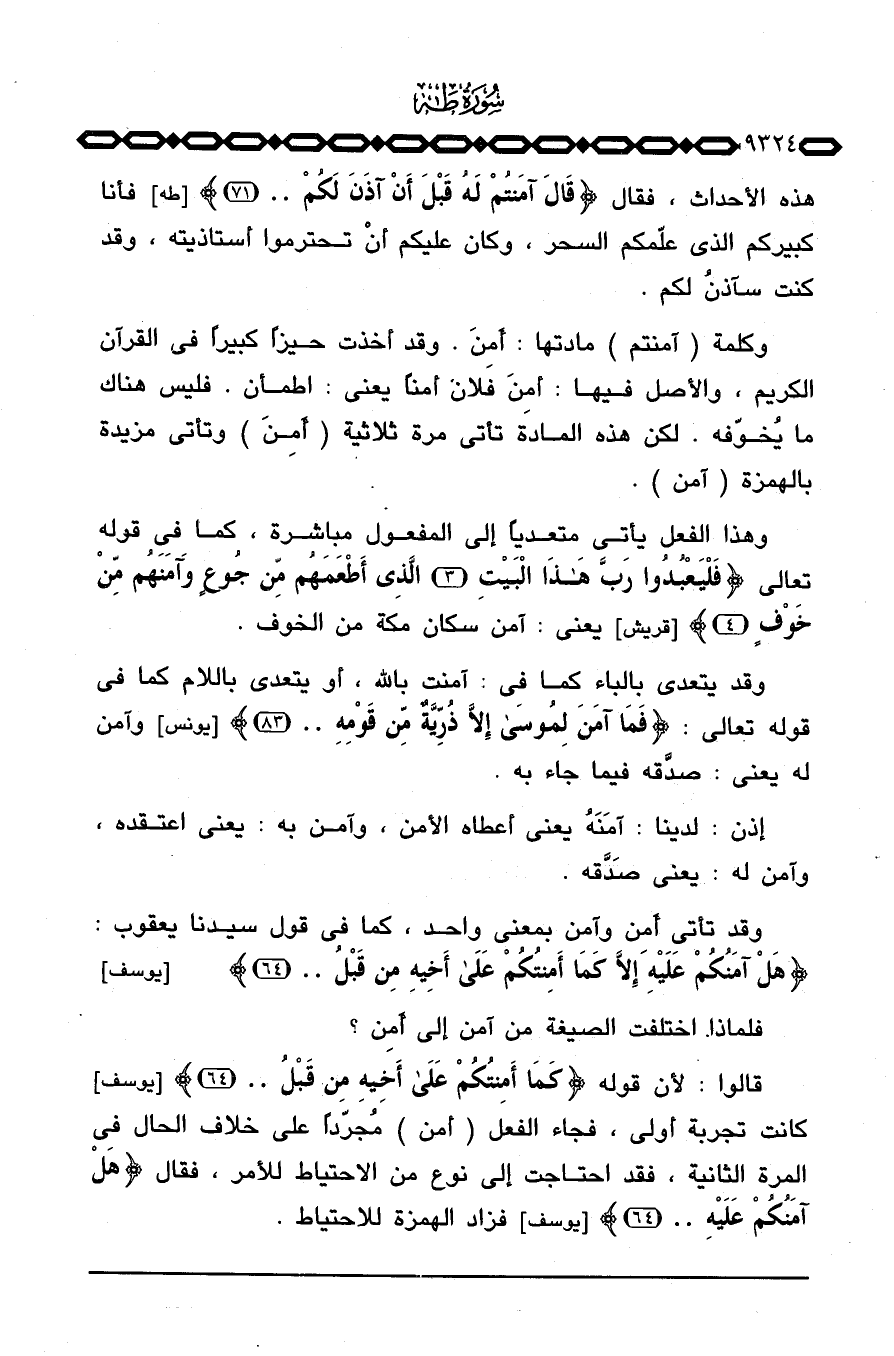 وهذا الفعل يأتي متعدياً إلى المفعول مباشرة، كما في قوله تعالى {فَلْيَعْبُدُواْ رَبَّ هذا البيت الذي أَطْعَمَهُم مِّن جُوعٍ وَآمَنَهُم مِّنْ خَوْفٍ} [قريش: 34] يعني: آمن سكان مكة من الخوف.