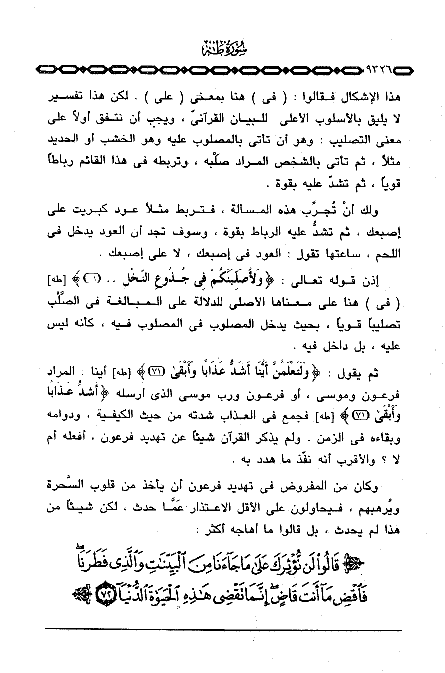 هذا الإشكال فقالوا: (في) هنا بمعنى (على) . لكن هذا تفسير لا يليق بالأسلوب الأعلى للبيان القرآنيّ، ويجب أن نتفق أولاً على معنى التصليب: وهو أن تأتي بالمصلوب عليه وهو الخشب أو الحديد مثلاً، ثم تأتي بالشخص المراد صَلْبه، وتربطه في هذا القائم رباطاً قوياً، ثم تشدّ عليه بقوة.