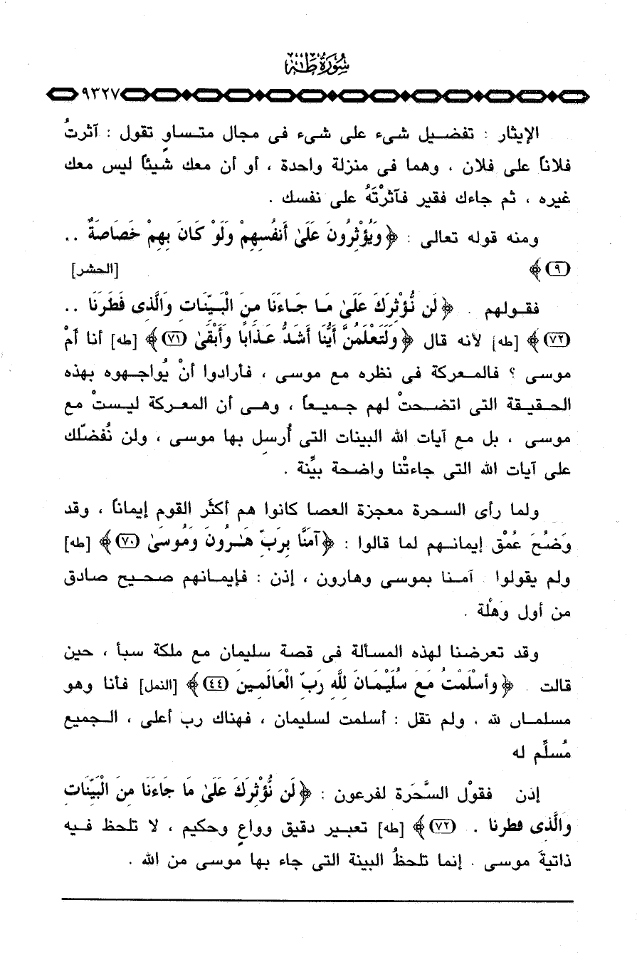 ومنه قوله تعالى: {وَيُؤْثِرُونَ على أَنفُسِهِمْ وَلَوْ كَانَ بِهِمْ خَصَاصَةٌ} [الحشر: 9] .