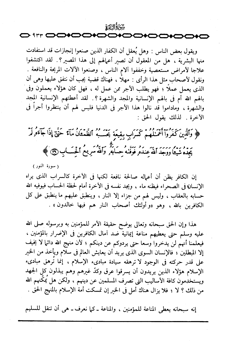 ويقول بعض الناس: وهل يُعقل أن الكفار الذين صنعوا إنجازات قد استفادت منها البشرية، هل من المعقول أن تصير أعمالهم إلى هذا المصير؟ . لقد اكتشفوا علاجا لأمراض مستعصية وخففوا آلام الناس، وصنعوا الآلات المريحة والنافعة. ونقول لأصحاب مثل هذا الرأي: مهلاً، فهناك قضية يجب أن نتفق عليها وهي أن الذي يعمل عملاً؛ فهو يطلب الأجر ممن عمل له، فهل كان هؤلاء يعملون وفي بالهم الله أم في بالهم الإنسانية والمجد والشهرة، وما داموا قد نالوا هذا الأجر في الدنيا فليس لهم أن ينتظروا أجراً في الآخرة. لذلك يقول الحق: {والذين كفروا أَعْمَالُهُمْ كَسَرَابٍ بِقِيعَةٍ يَحْسَبُهُ الظمآن مَآءً حتى إِذَا جَآءَهُ لَمْ يَجِدْهُ شَيْئاً وَوَجَدَ الله عِندَهُ فَوَفَّاهُ حِسَابَهُ والله سَرِيعُ الحساب} [النور: 39]
