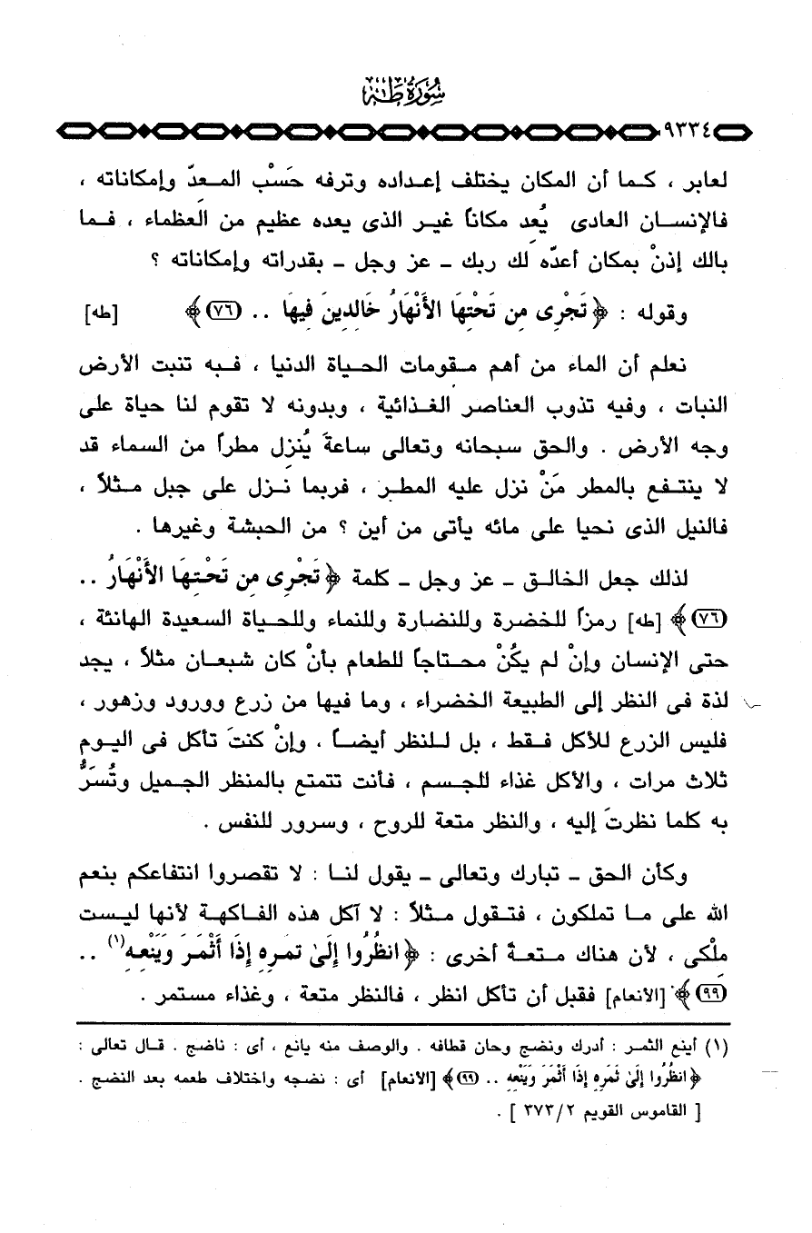 لذلك جعل الخالق عَزَّ وَجَلَّ كلمة {تَجْرِي مِن تَحْتِهَا الأنهار} [طه: 76] رمزاً للخضرة وللنضارة وللنماء وللحياة السعيدة الهانئة، حتى الإنسان وإنْ لم يكُنْ محتاجاً للطعام بأنْ كان شبعان مثلاً، يجد لذة في النظر إلى الطبيعة الخضراء، وما فيها من زرع وورود وزهور، فليس الزرع للأكل فقط، بل للنظر أيضاً، وإنْ كنتَ تأكل في اليوم ثلاث مرات، والأكل غذاء للجسم، فأنت تتمتع بالمنظر الجميل وتُسَرُّ به كلما نظرتَ إليه، والنظر متعة للروح، وسرور للنفس.
