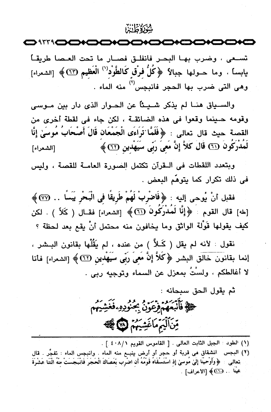 تسعى، وضرب بها البحر فانفلق فصار ما تحت العصا طريقاً يابساً، وما حولها جبالاً {كُلُّ فِرْقٍ كالطود العظيم} [الشعراء: 63] وهي التي ضرب بها الحجر فانبجس منه الماء.