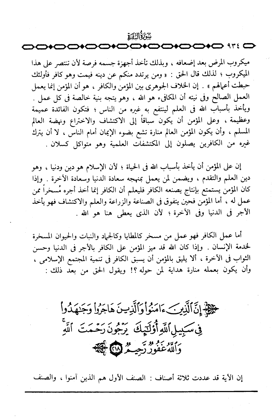 ميكروب المرض بعد إضعافه، وبذلك تأخذ أجهزة جسمه فرصة لأن تنتصر على هذا الميكروب؛ لذلك قال الحق: {وَمَن يَرْتَدِدْ مِنْكُمْ عَن دِينِهِ فَيَمُتْ وَهُوَ كَافِرٌ فأولائك حَبِطَتْ أَعْمَالُهُمْ} . إن الخلاف الجوهري بين المؤمن والكافر، هو أن المؤمن إنما يعمل العمل الصالح وفي نيته أن المكافئ هو الله، وهو يتجه بنية خالصة في كل عمل. ويأخذ بأسباب الله في العلم لينتفع به غيره من الناس؛ فتكون الفائدة عميمة وعظيمة، وعلى المؤمن أن يكون سباقاً إلى الاكتشاف والاختراع ونهضة العالم المسلم، وأن يكون المؤمن العالم منارة تشع بضوء الإيمان أمام الناس، لا أن يترك غيره من الكافرين يصلون إلى المكتشفات العلمية وهو متواكل كسلان.