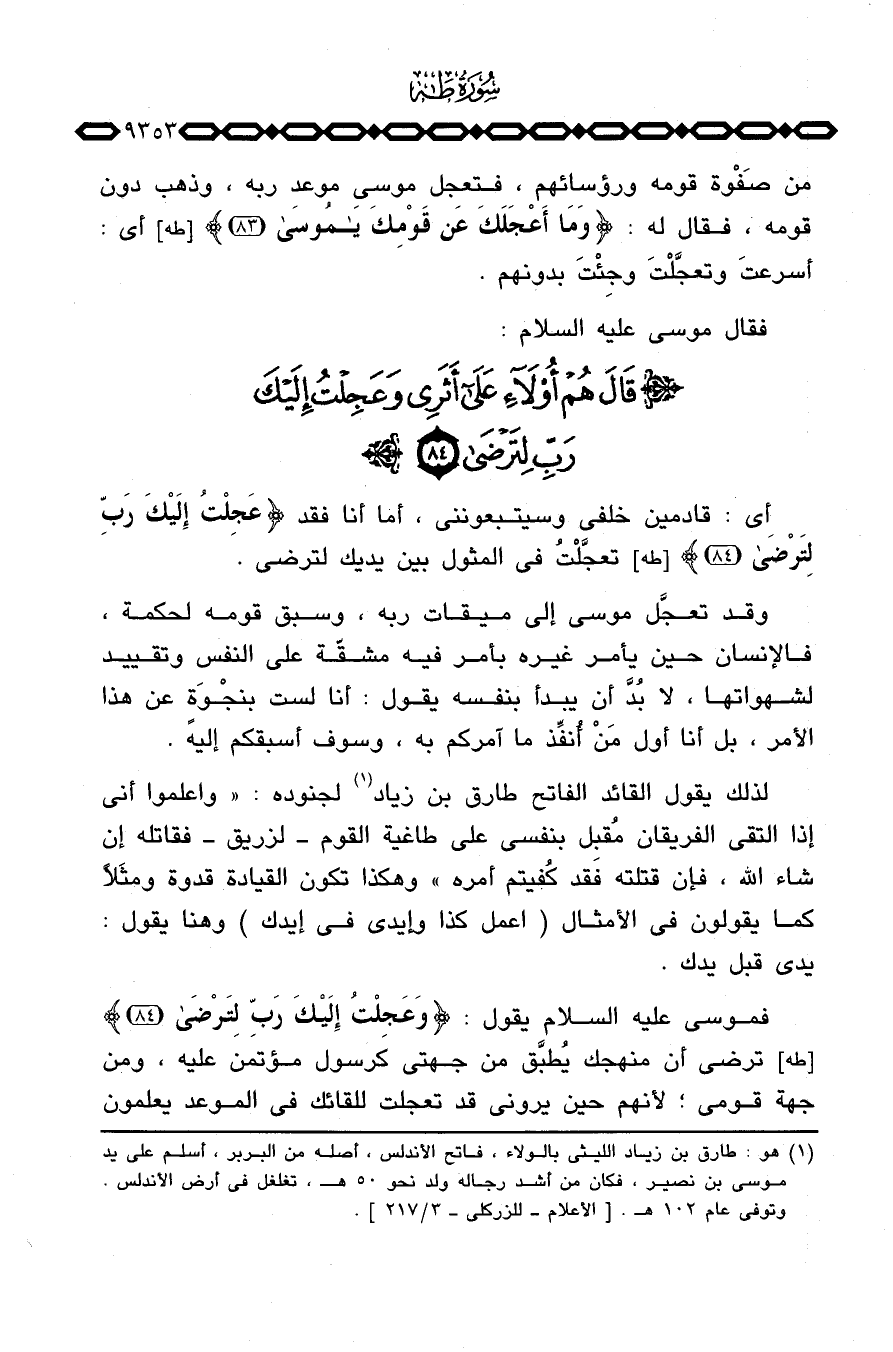 وقد تعجَّل موسى إلى ميقات ربه، وسبق قومه لحكمة، فالإنسان حين يأمر غيره بأمر فيه مشقّة على النفس وتقييد لشهواتها، لا بُدَّ أن يبدأ بنفسه يقول: أنا لست بنجْوَةٍ عن هذا الأمر، بل أنا أول مَنْ أُنفِّذ ما آمركم به، وسوف أسبقكم إليه.