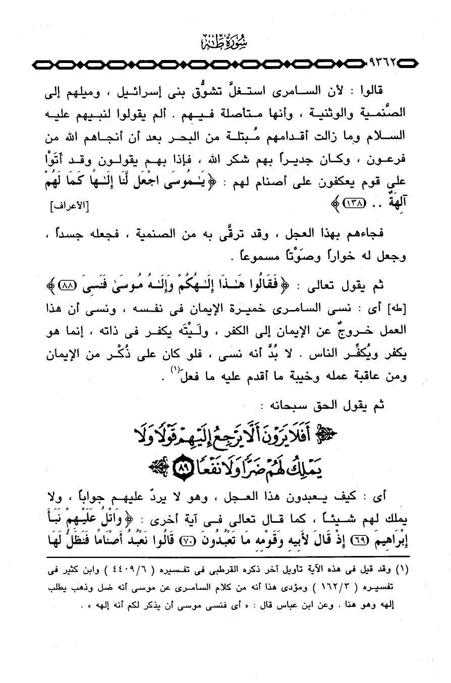 ثم يقول تعالى: {فَقَالُواْ هاذآ إلهكم وإله موسى فَنَسِيَ} [طه: 88] أي: نسي السامري خميرة الإيمان في نفسه، ونسي أن هذا العمل خروجٌ عن الإيمان إلى الكفر، ولَيْتَه يكفر في ذاته، إنما هو يكفر ويُكفِّر الناس. لا بُدَّ أنه نسي، فلو كان على ذُكْر من الإيمان ومن عاقبه عمله وخيبة ما أقدم عليه ما فعل.