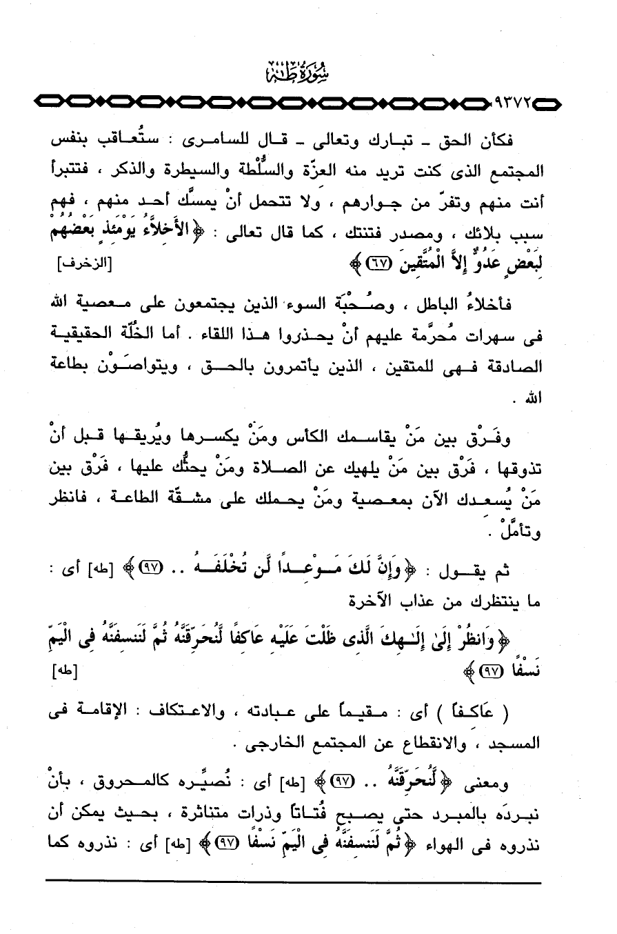 ومعنى {لَّنُحَرِّقَنَّهُ} [طه: 97] أي: نُصيِّره كالمحروق، بأنْ نبردَه بالمبرد حتى يصبح فُتاتاً وذرات متناثرة، بحيث يمكن أن نذروه في الهواء {ثُمَّ لَنَنسِفَنَّهُ فِي اليم نَسْفاً} [طه: 97] أي: نذروه كما