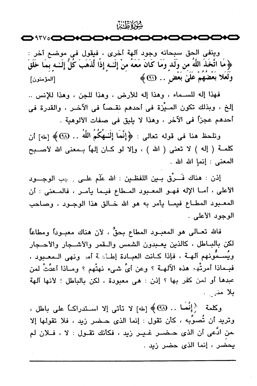 ونلحظ هنا في قوله تعالى: {إِنَّمَآ إلهكم الله} [طه: 98] أن كلمة (إله) لا تعني (الله) ، وإلا لو كان إلهاً بمعنى الله لأصبح المعنى: إنما الله الله.