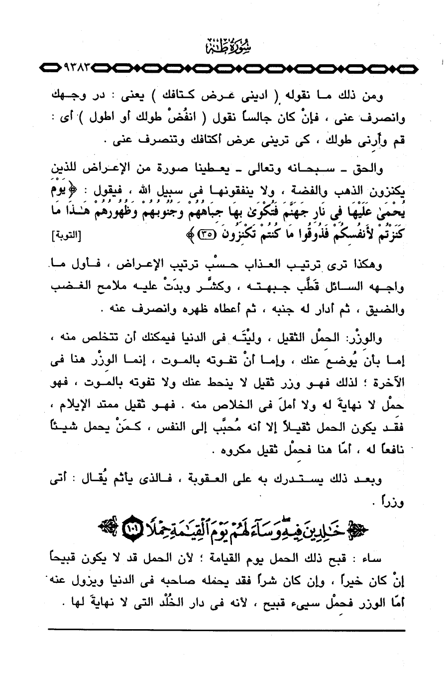 والوِزْر: الحِمْل الثقيل، وليْتَه في الدنيا فيمكنك أن تتخلص منه، إما بأنْ يُوضع عنك، وإما أنْ تفوته بالموت، إنما الوِزْر هنا في الآخرة؛ لذلك فهو وزر ثقيل لا ينحط عنك ولا تفوته بالموت، فهو حِمْل لا نهايةَ له ولا أملَ في الخلاص منه. فهو ثقيل ممتد الإيلام، فقد يكون الحمل ثقيلاً إلا أنه مُحبَّب إلى النفس، كمَنْ يحمل شيئاً نافعاً له، أمّا هنا فحِمْل ثقيل مكروه.