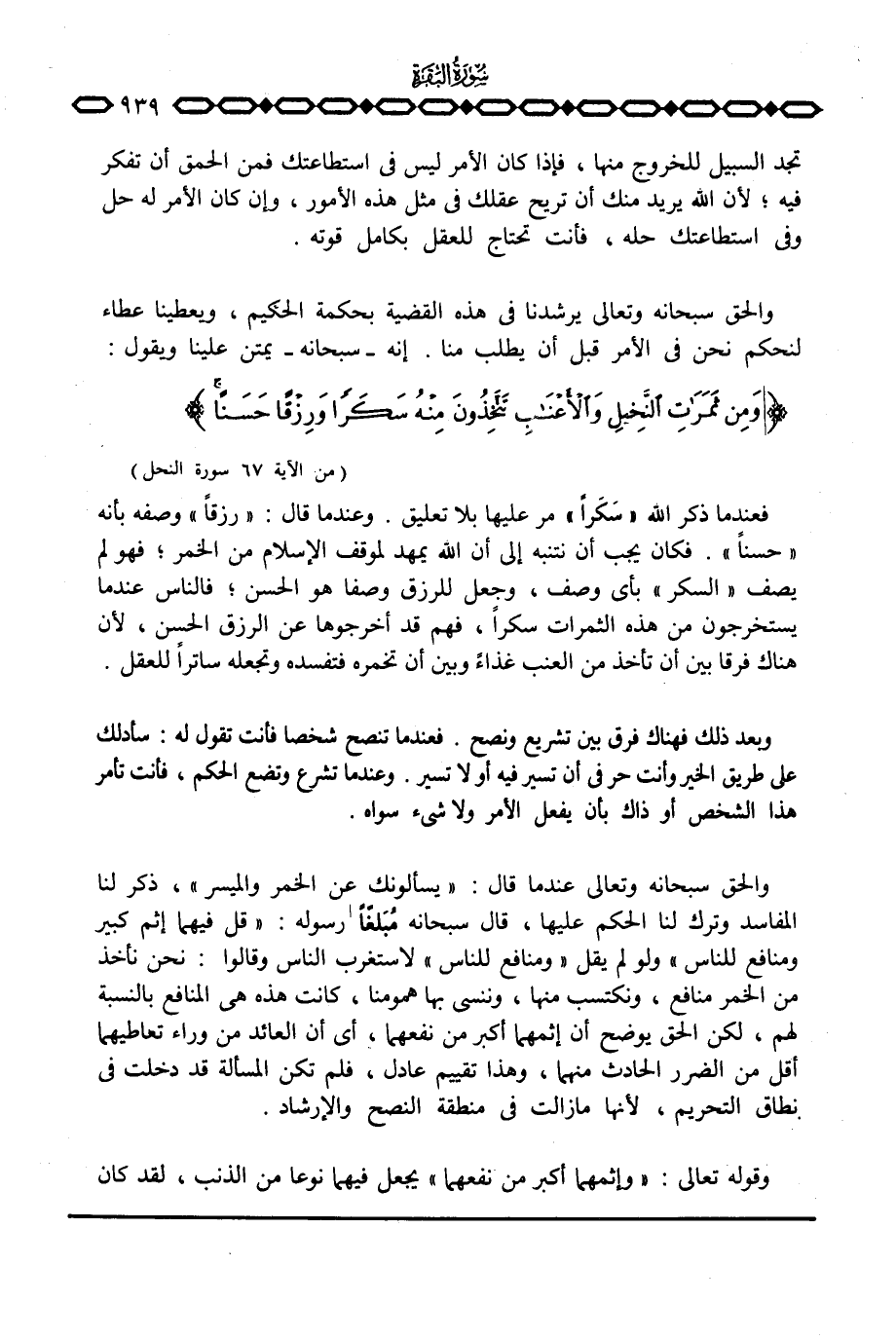 والحق سبحانه وتعالى عندما قال: {يَسْأَلُونَكَ عَنِ الخمر والميسر} ، ذكر لنا المفاسد وترك لنا الحكم عليها، قال سبحانه مُبَلغّاً رسوله: {قُلْ فِيهِمَآ إِثْمٌ كَبِيرٌ وَمَنَافِعُ لِلنَّاسِ} ولو لم يقل {وَمَنَافِعُ لِلنَّاسِ} لاستغرب الناس وقالوا: نحن نأخذ من الخمر منافع، ونكتسب منها، وننسى بها همومنا، كانت هذه هي المنافع بالنسبة لهم، لكن الحق يوضح أن إثمهما أكبر من نفعهما، أي أن العائد من وراء تعاطيهما أقل من الضرر الحادث منهما، وهذا تقييم عادل، فلم تكن المسألة قد دخلت في نطاق التحريم، لأنها مازالت في منطقة النصح والإرشاد.