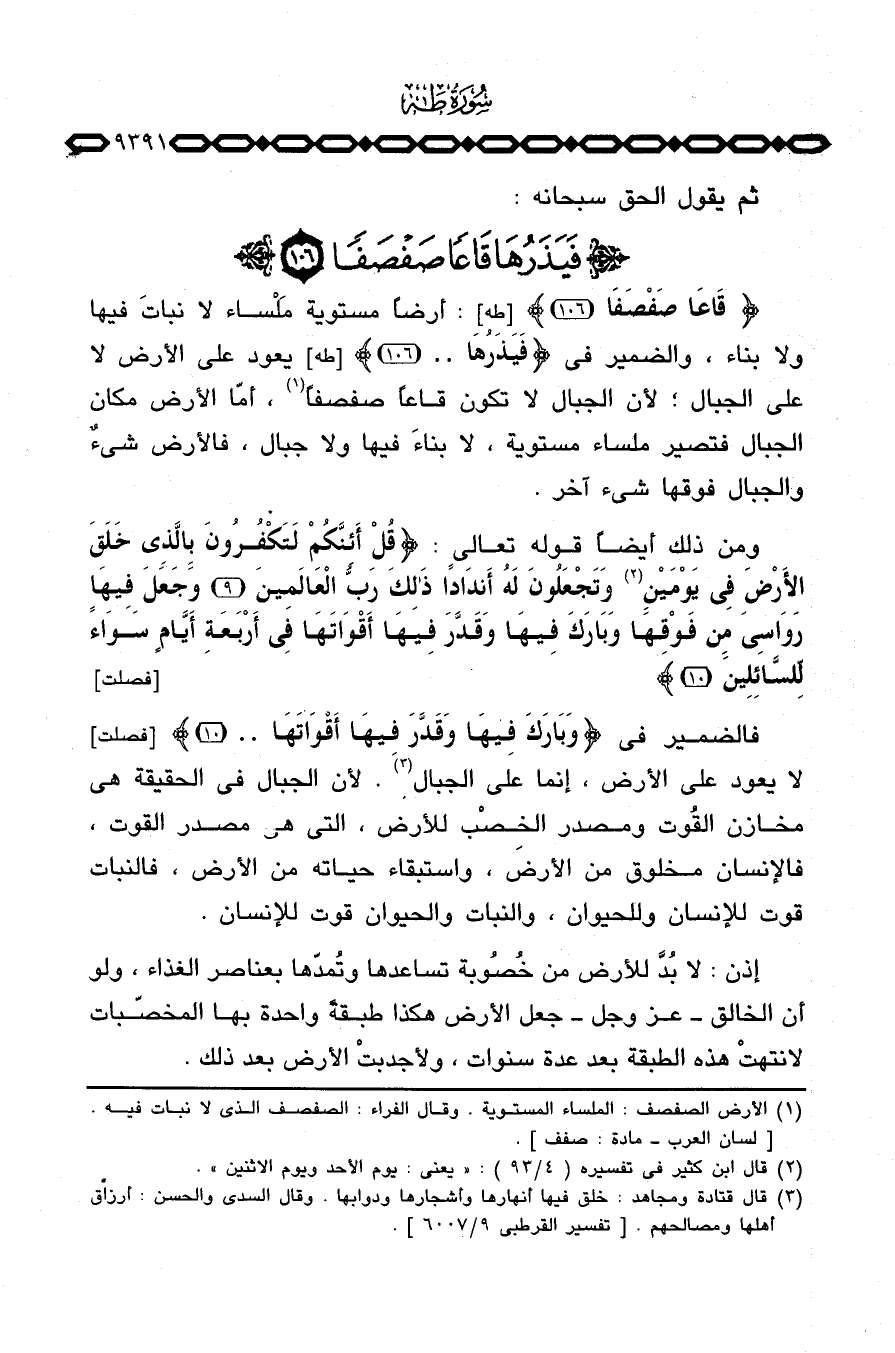 {قَاعاً صَفْصَفاً} [طه: 106] : أرضاً مستوية مَلْساء لا نباتَ فيها ولا بناء، والضمير في {فَيَذَرُهَا} [طه: 106] يعود على الأرض لا على الجبال؛ لأن الجبال لا تكون قاعاً صفصفاً، أمّا الأرض مكان الجبال فتصير ملساء مستوية، لا بناءَ فيها ولا جبال، فالأرض شيءٌ والجبال فوقها شيء آخر.